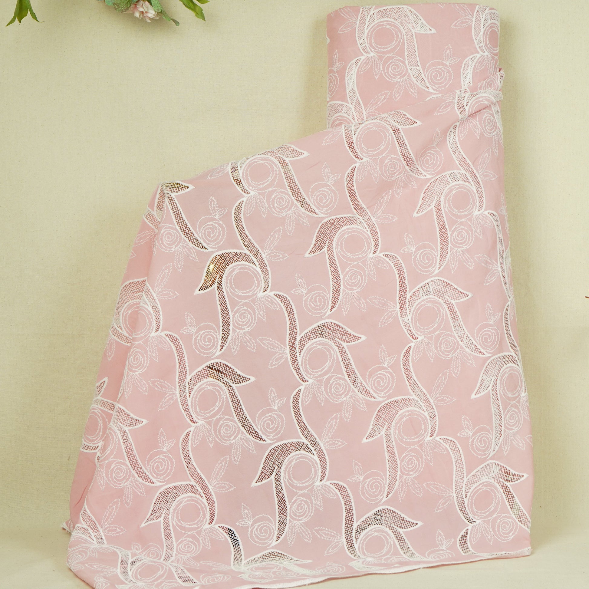Soft and elegant, this Baby Pink Schiffli Crepe Fabric features delicate floral embroidery that adds a touch of sophistication. Lightweight and flowy, it drapes beautifully, making it ideal for dresses, tops, and ethnic wear. Perfect for festive occasions or casual elegance, it combines style, comfort, and premium quality.