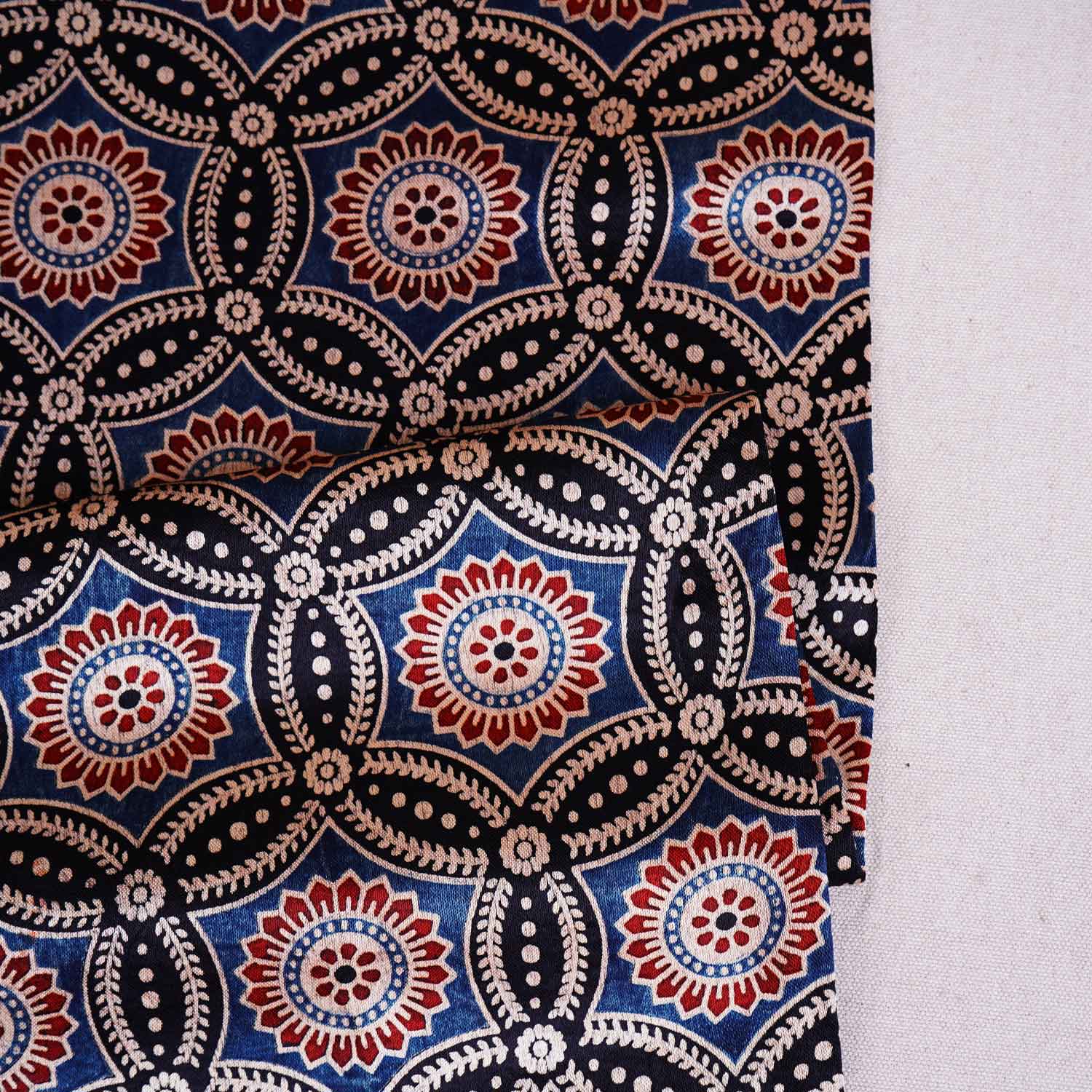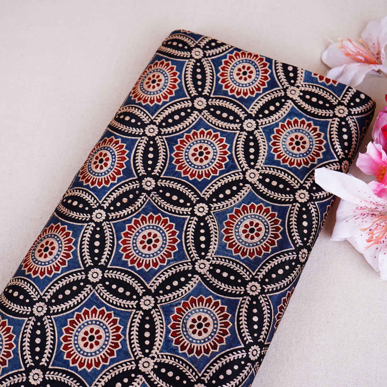 This Black Ajrakh Print Mashru Silk Fabric blends handcrafted Ajrakh motifs with the soft sheen of Mashru, creating a bold yet elegant canvas. Its fluid movement and rich tones make it ideal for lehengas, kurtas or statement ethnic sets that feel timeless and refined.