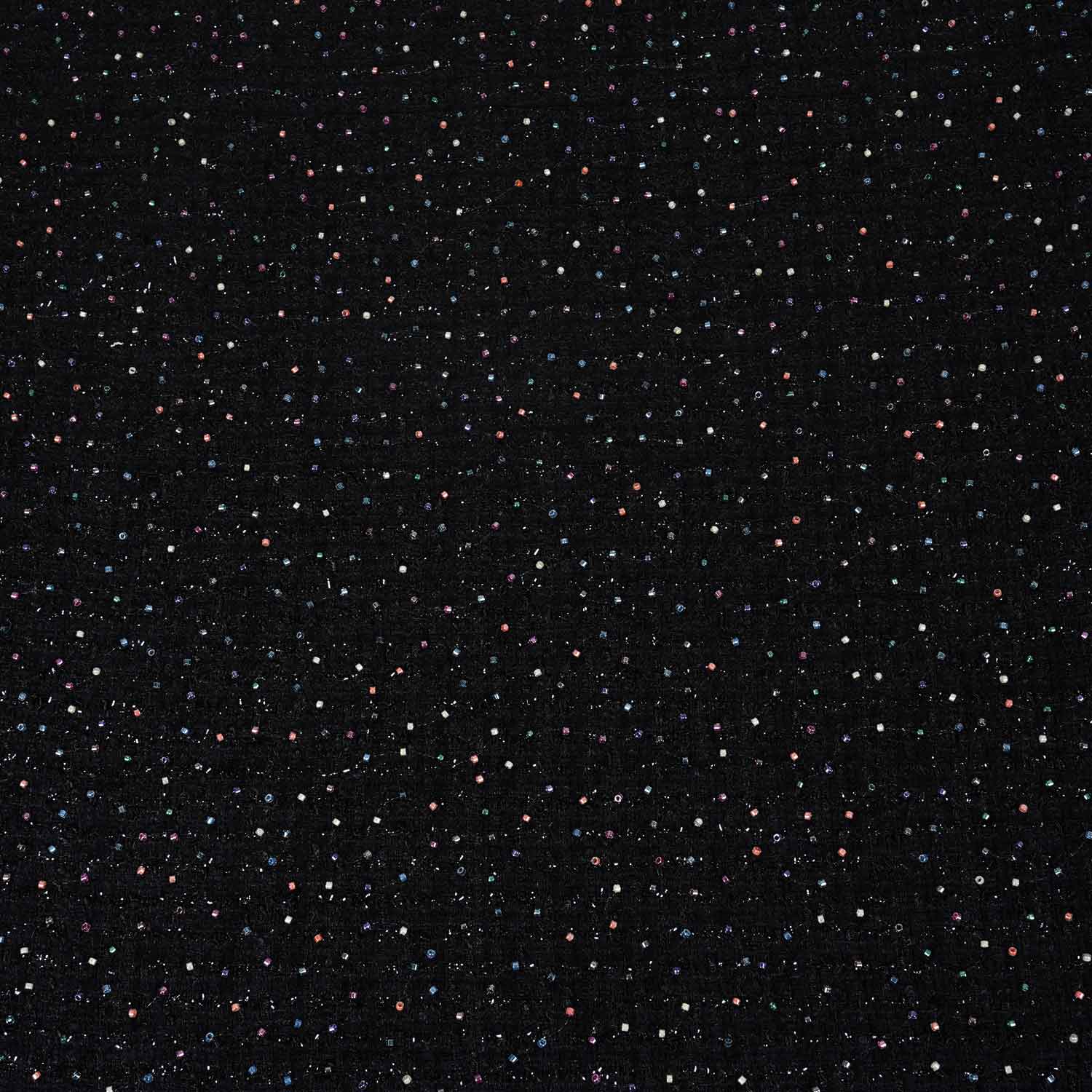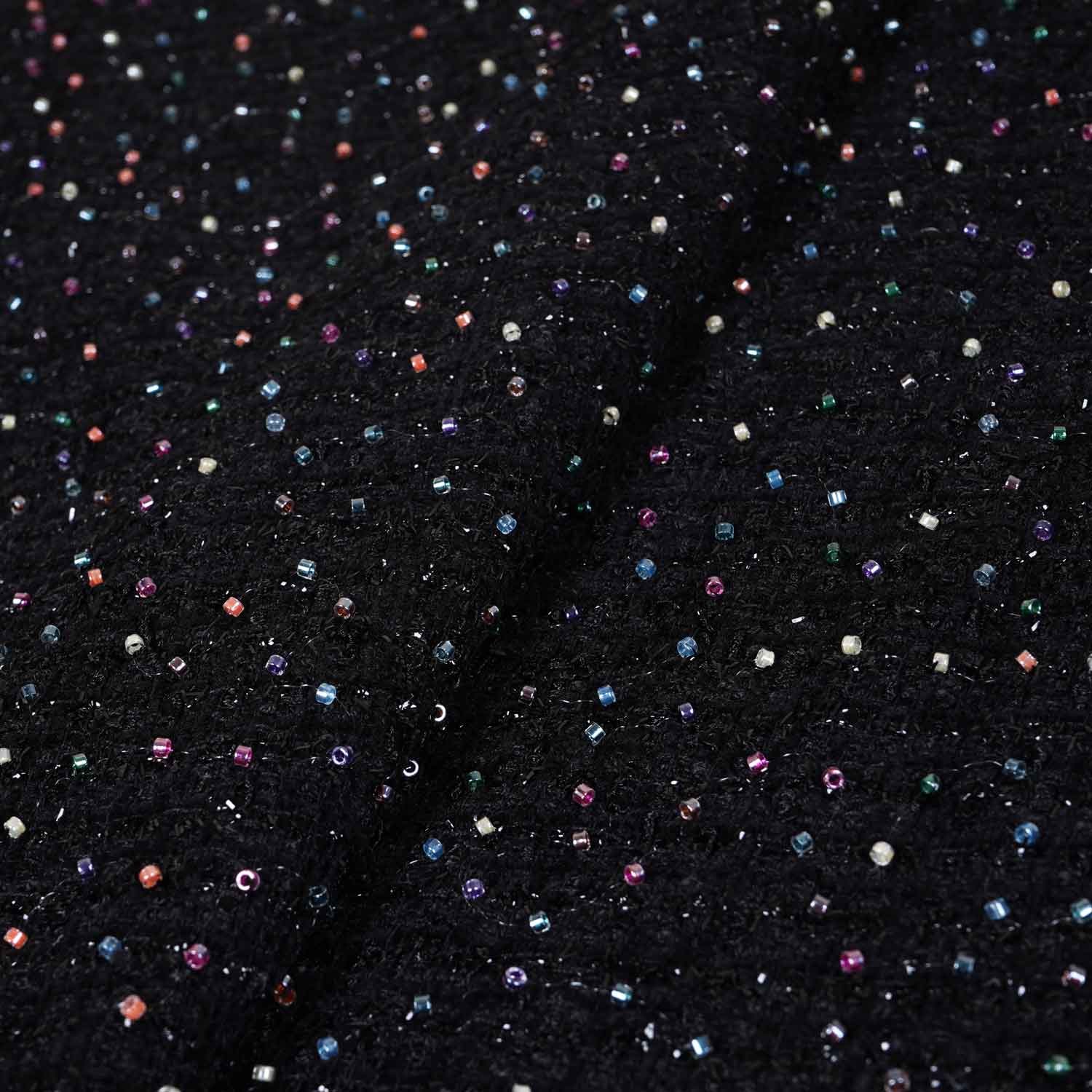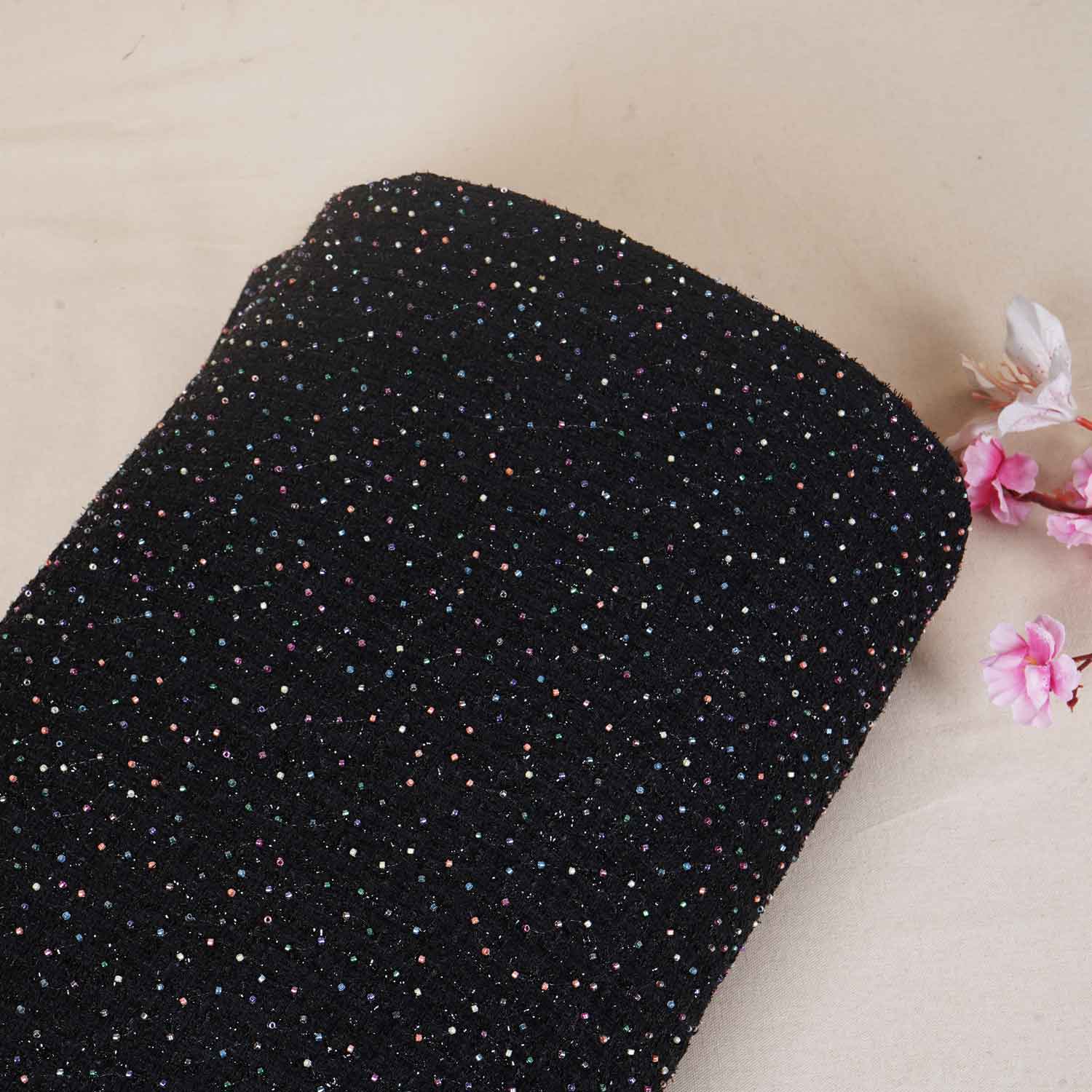 This Black Cutdana Tweed Fabric merges sparkling embellishments with textured elegance. Perfect for jackets, skirts, or festive ensembles that stand out.