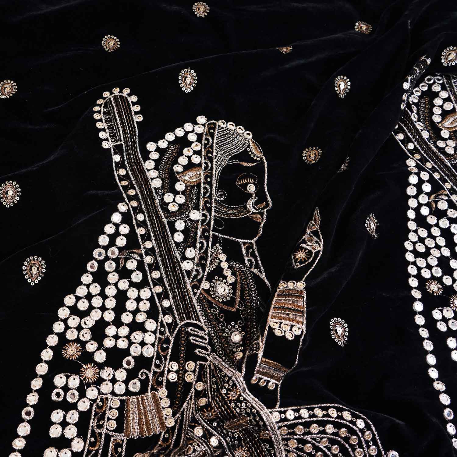 This Black Embroidery Velvet Fabric showcases rich velvet texture enhanced with detailed embroidery. The deep black base adds drama while the embroidery elevates it for occasion wear. Ideal for blouses, jackets, lehengas or panels that need a luxurious feel with strong visual impact.