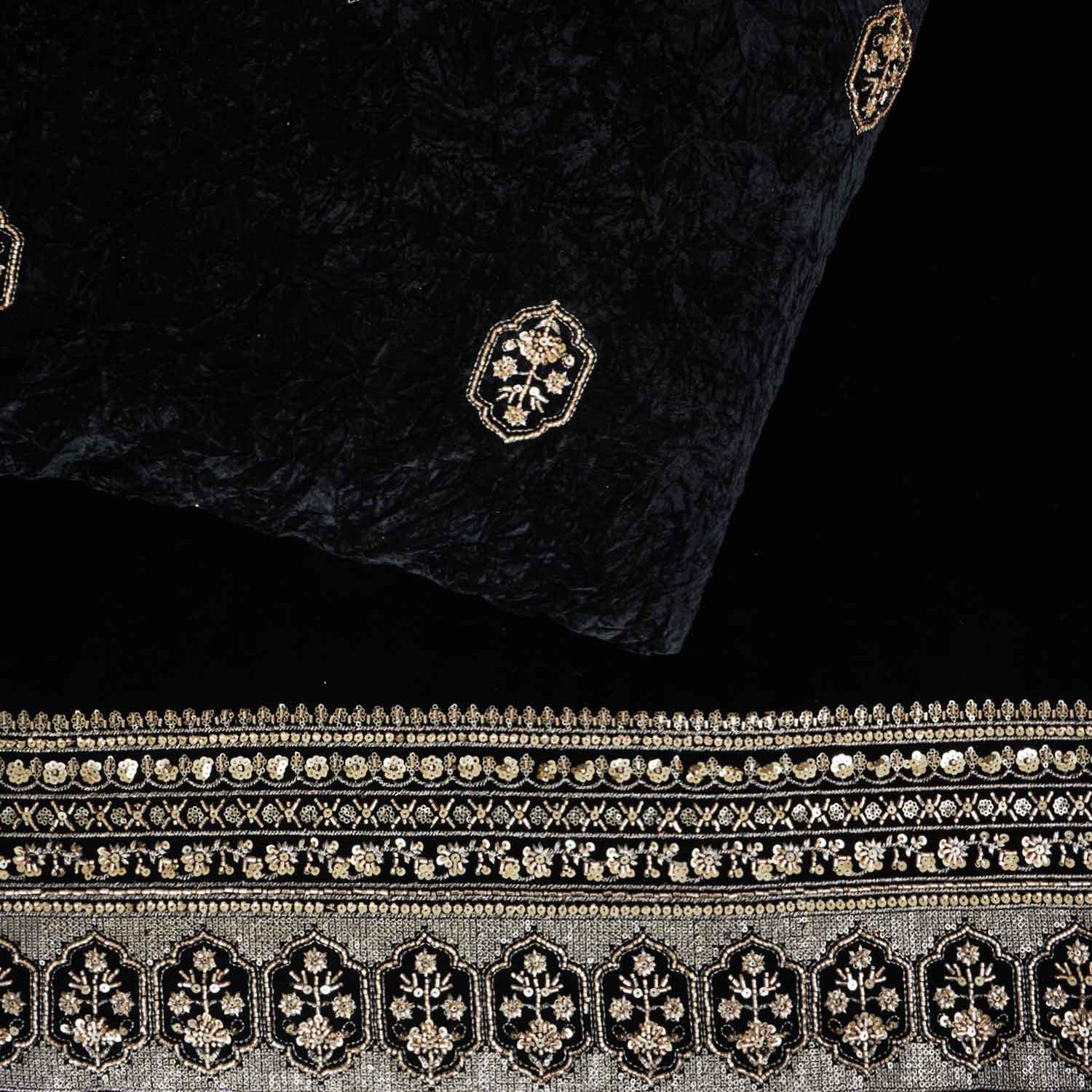 This Black Floral Cutdana Crushed Velvet fabric combines plush texture with floral handwork detailing. Soft yet striking, it’s crafted for blouses, pre-draped sarees, and regal silhouettes.