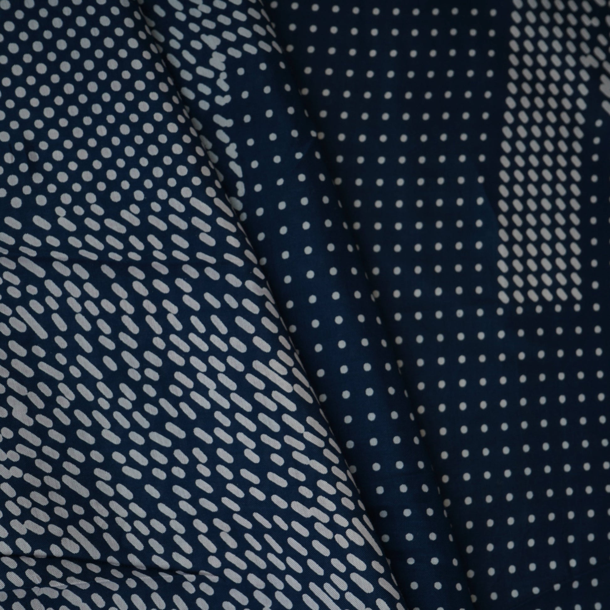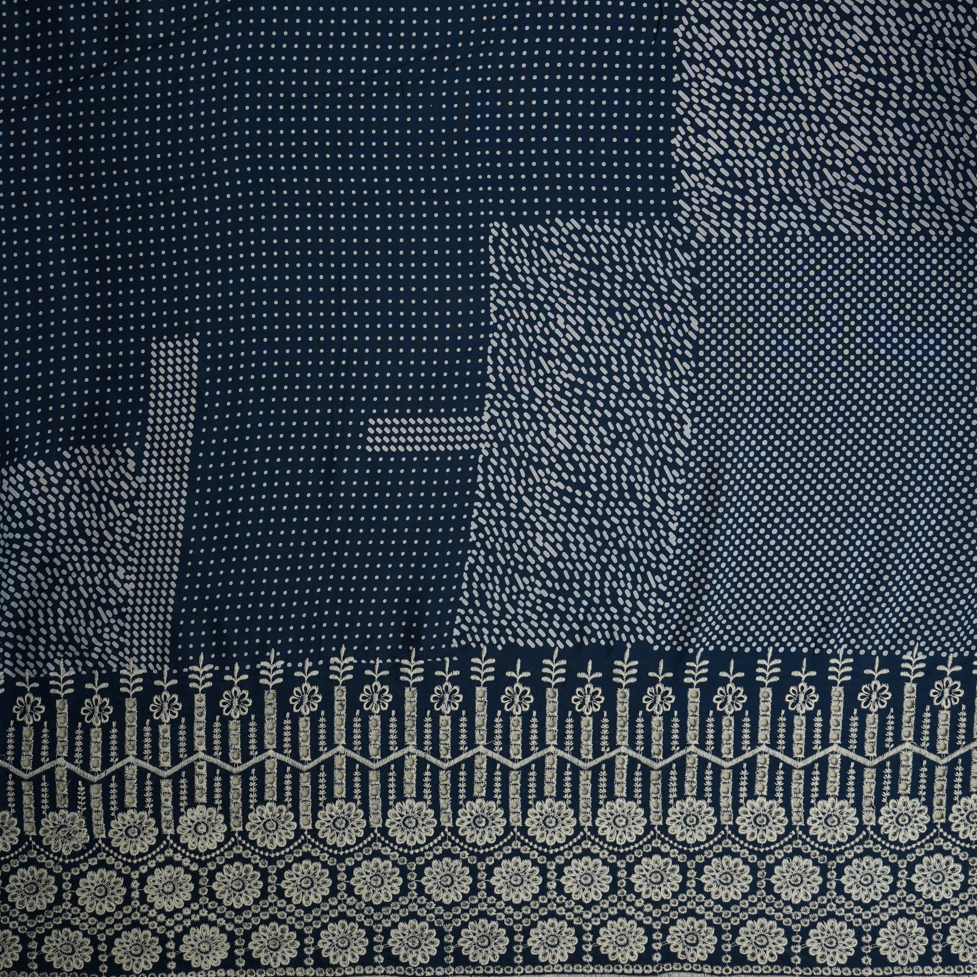 Blue with white dot print cotton Schiffli fabric features delicate embroidery on soft, breathable cotton. Its elegant dotted pattern combined with intricate Schiffli work creates a stylish and airy texture. Ideal for summer wear, dresses, kurtis, and tops, this fabric offers comfort, durability, and a chic, timeless appeal for everyday fashion.
