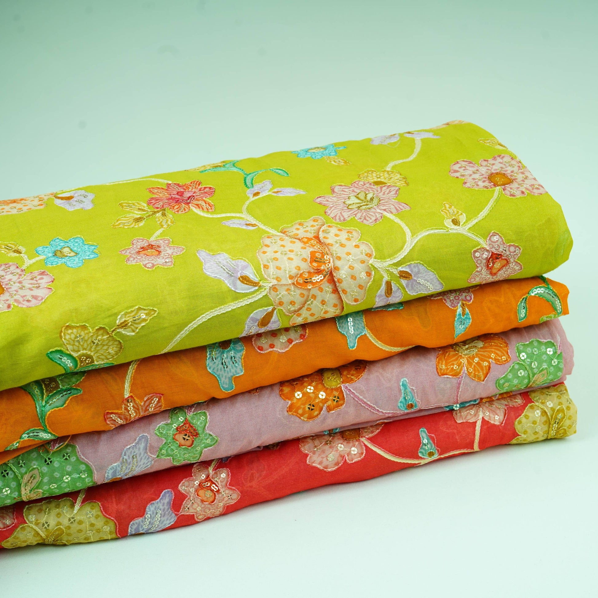 This Coral Pink floral embroidery Mul Chanderi Fabric features delicate floral embroidery on breathable mul chanderi fabric, making it charming and versatile and suited for ethnic silhouettes and festive occasions. The coral pink tone paired with kurtas, ethnic sets, and casual wear crafts graceful and elegant everyday pieces.