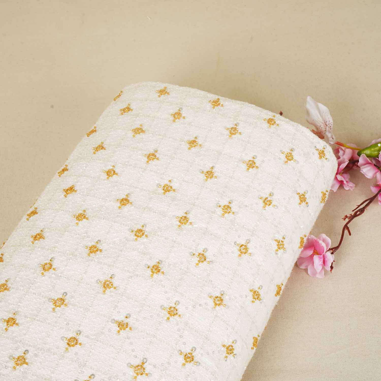 This Cream Cutdana Tweed Fabric merges sparkling embellishments with textured elegance. Perfect for jackets, skirts, or festive ensembles that stand out.