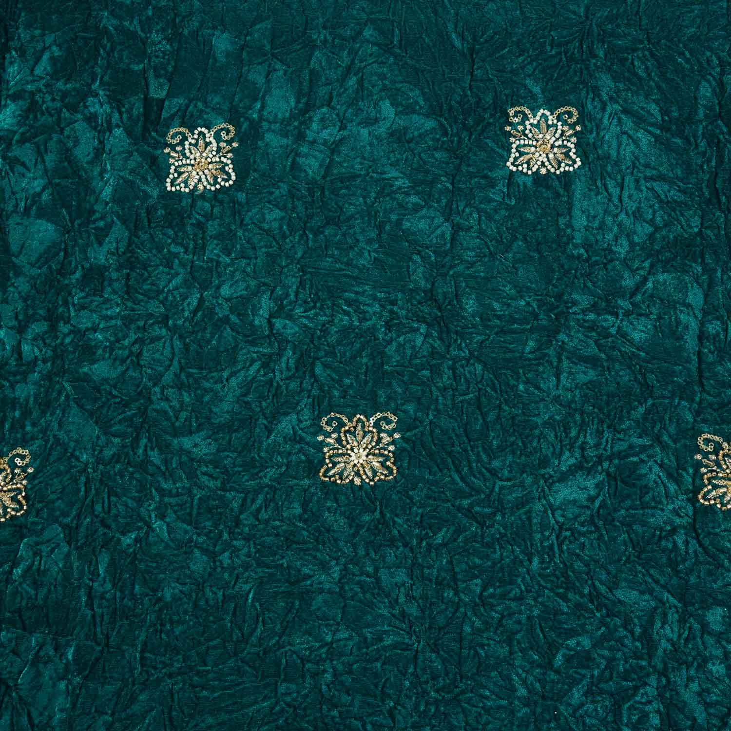 This Green Floral Cutdana Crushed Velvet 9000 fabric merges soft velvet with delicate sparkling florals. Ideal for festive lehengas, kurtas, or statement ensembles.