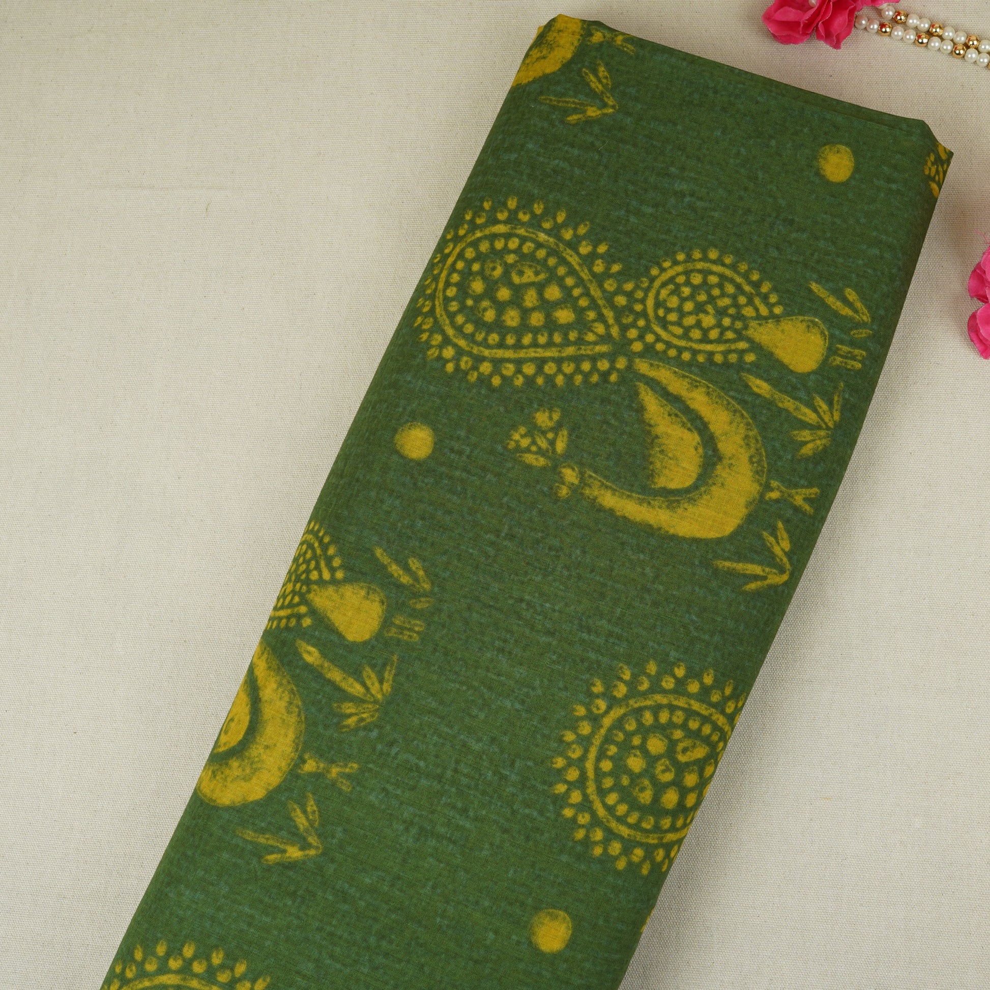Product Name Green with Golden Paisley Print Cotton Fabric MFR-29894
