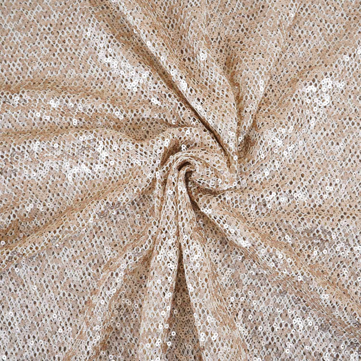 This Light Golden Sequins Power Net Fabric offers a soft metallic glow with a flexible, supportive net base. The sequins add festive shine while keeping the fabric wearable and lightweight. Ideal for gowns, blouses or panels that require both structure and a subtle, elegant sparkle.