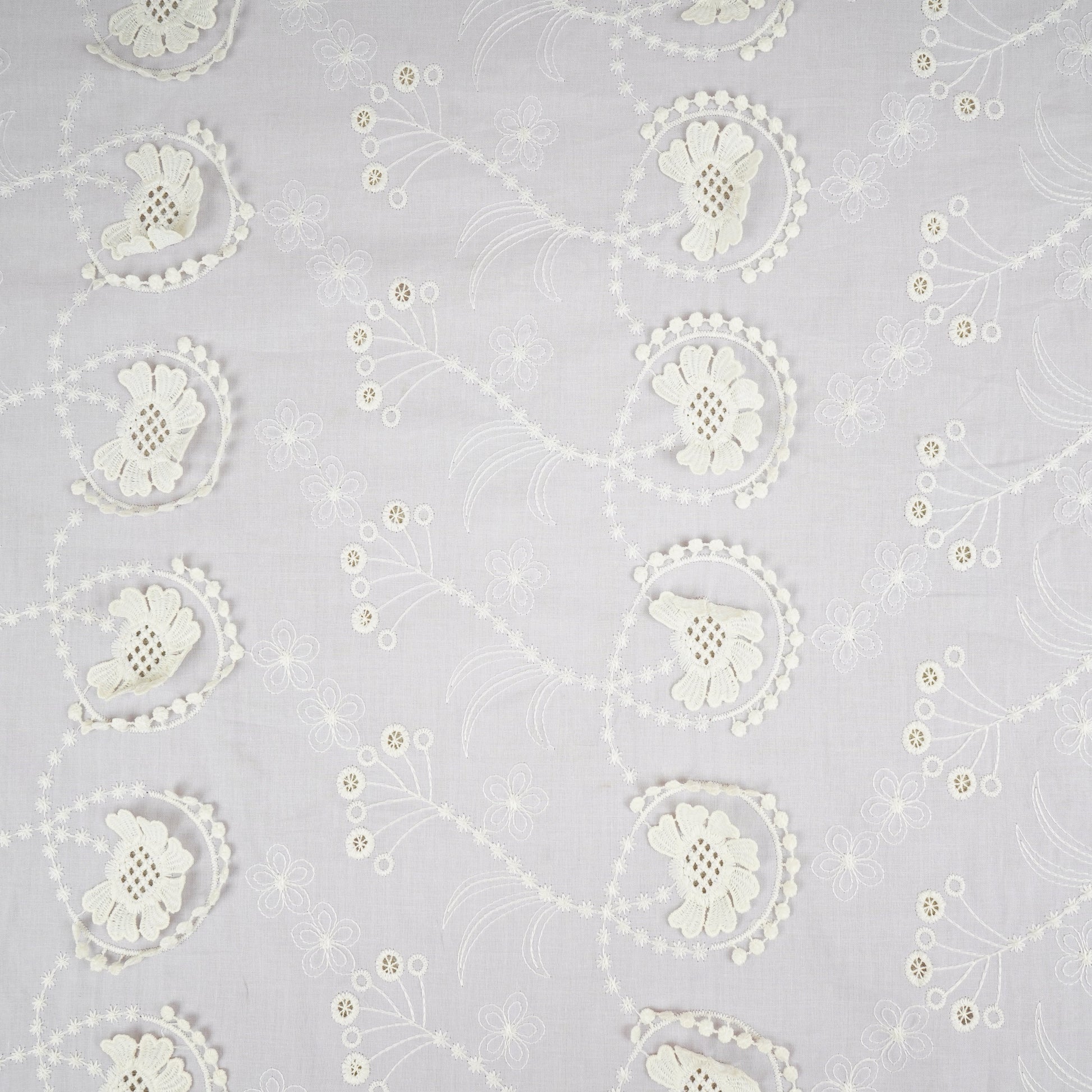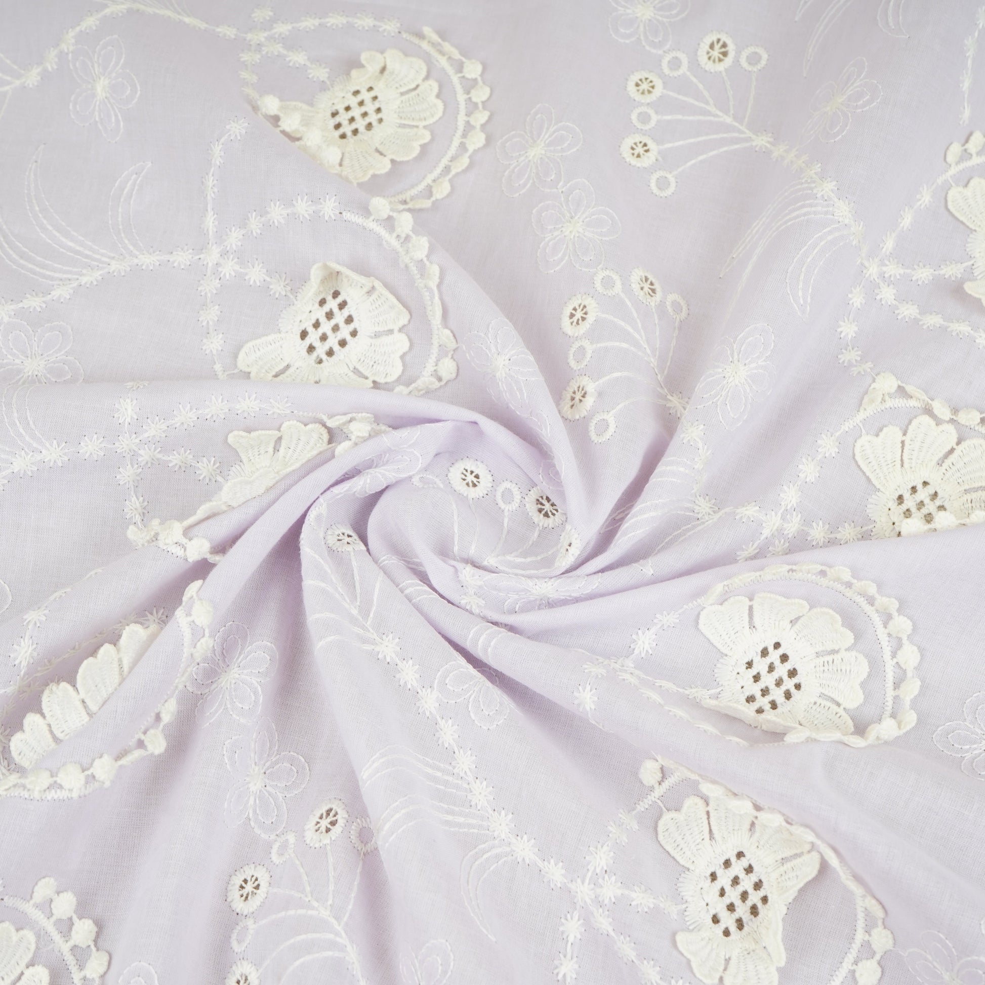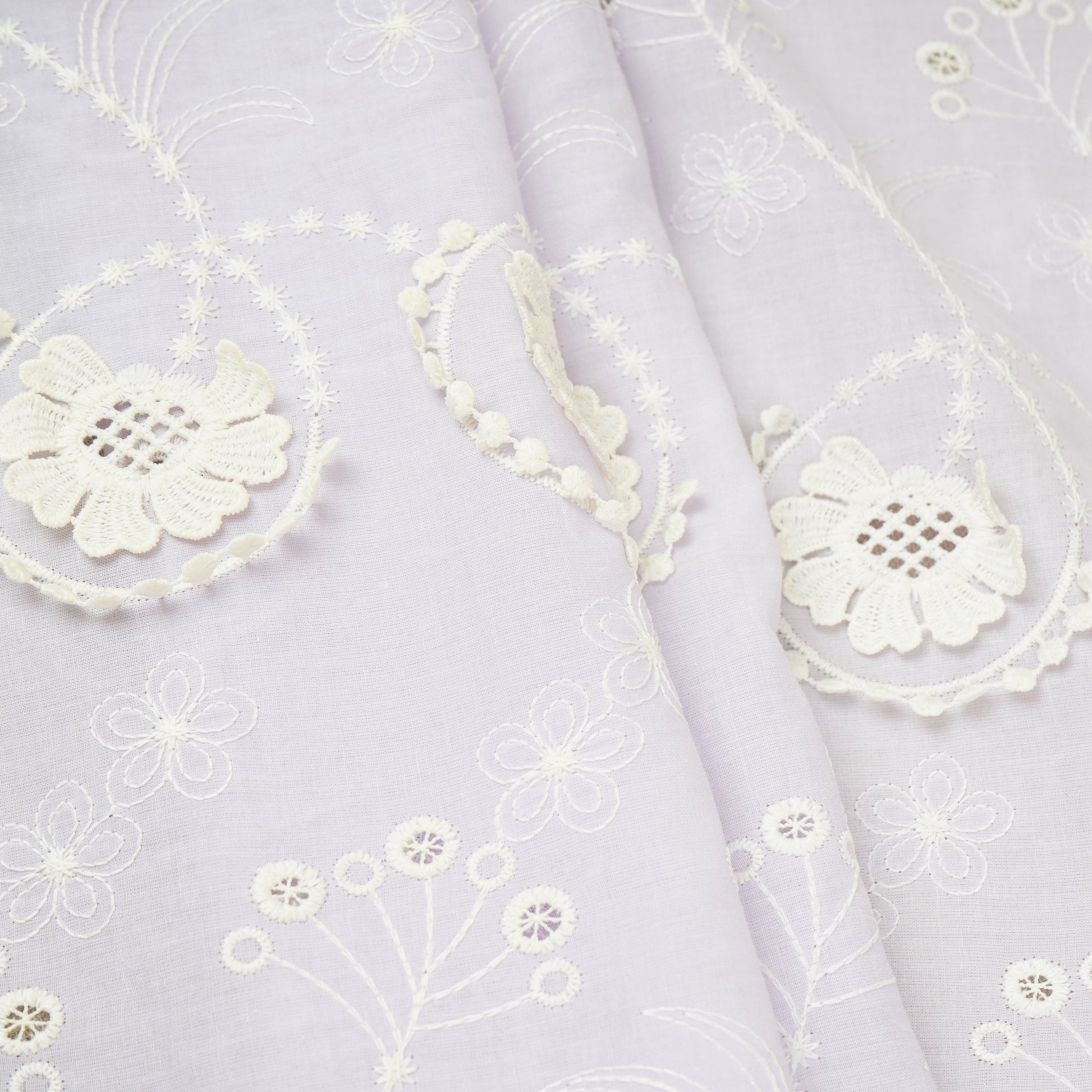 Elegant lilac cotton fabric adorned with intricate 3D Schiffli floral embroidery. Soft, breathable, and lightweight, perfect for making stylish dresses, kurta sets, or festive wear. Adds a delicate, textured charm to any outfit, combining traditional craftsmanship with contemporary elegance.