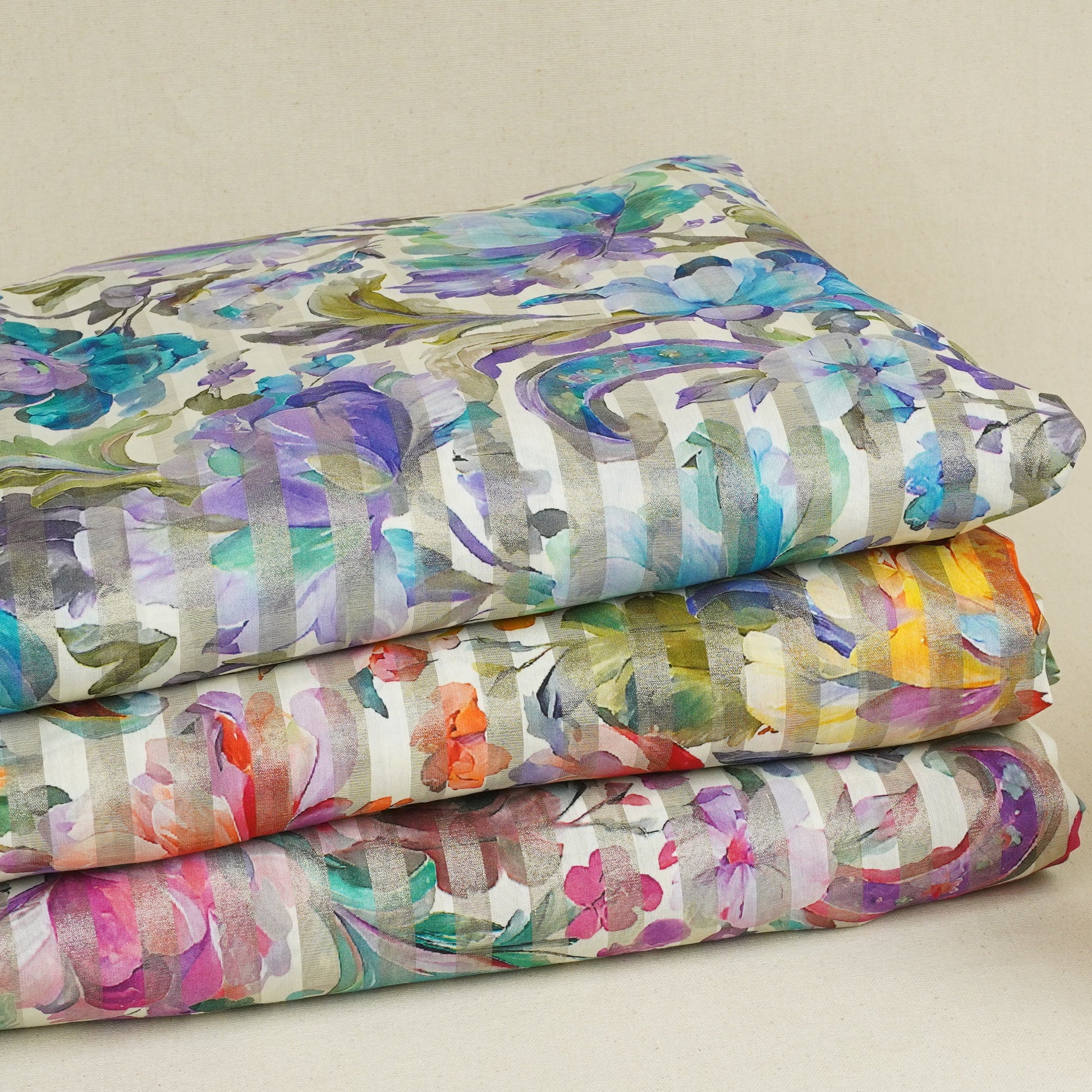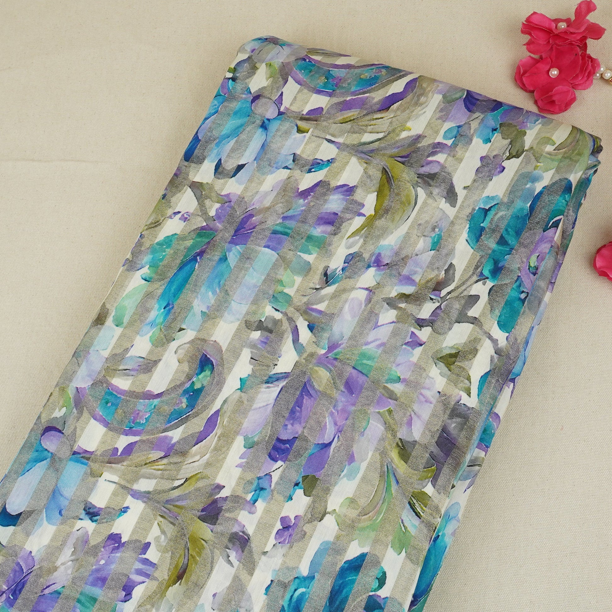 Elegant off-white tissue Chanderi fabric featuring a delicate multicolor floral print. Lightweight and breathable, perfect for ethnic wear, summer outfits, or festive occasions. Its subtle sheen and soft texture make it ideal for sarees, dresses, and kurta sets, adding a touch of grace and sophistication to any ensemble.”