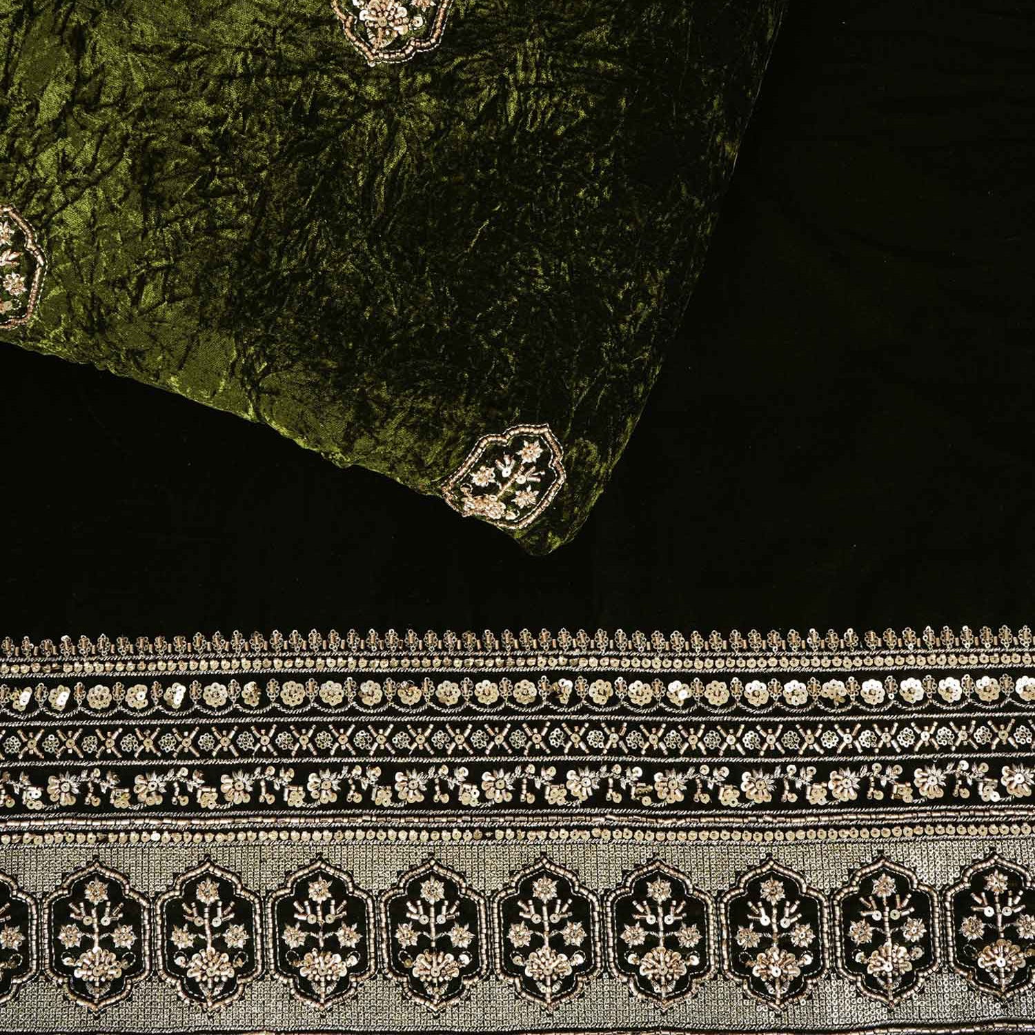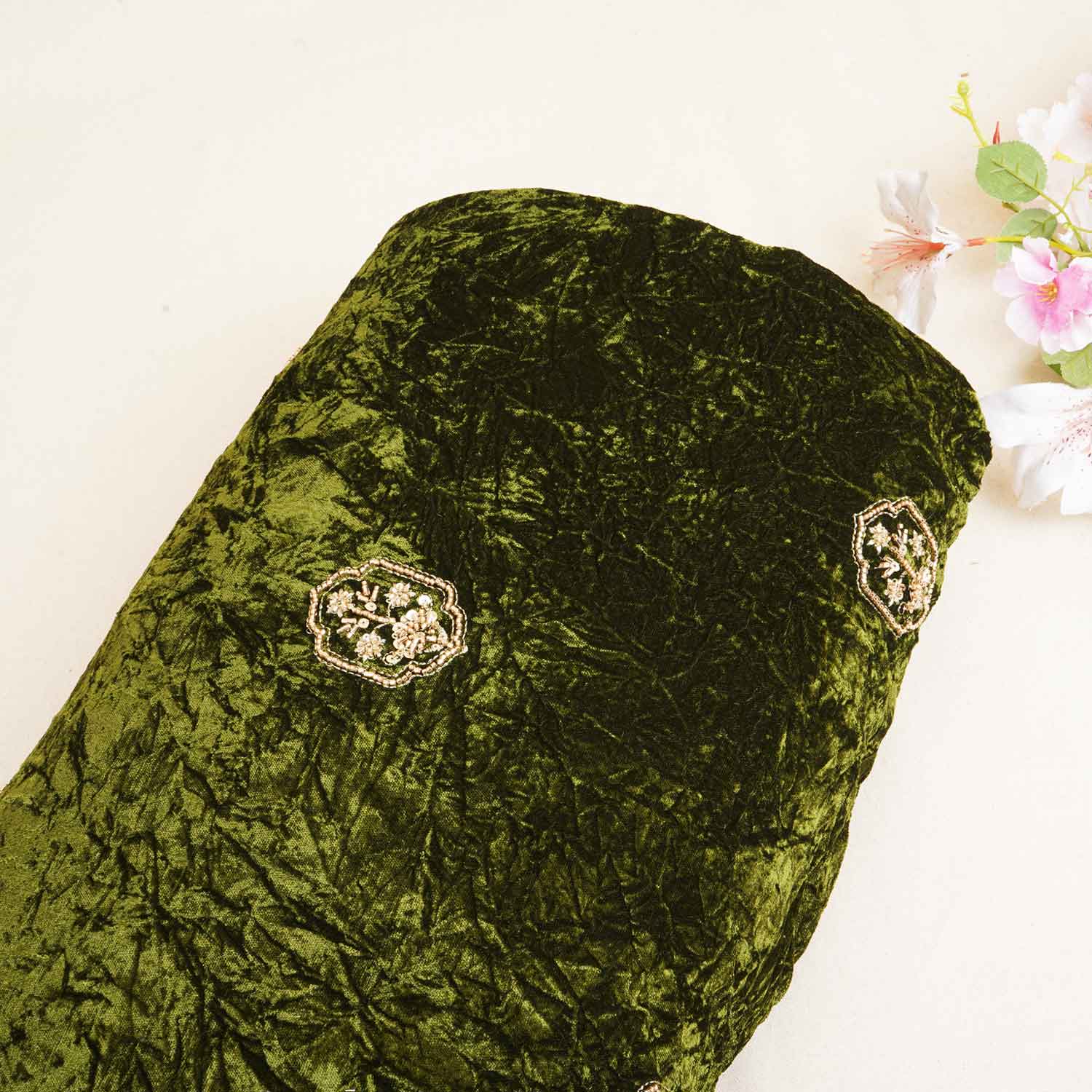 Olive Green Floral Cutdana Crushed Velvet Fabric SC-28301
