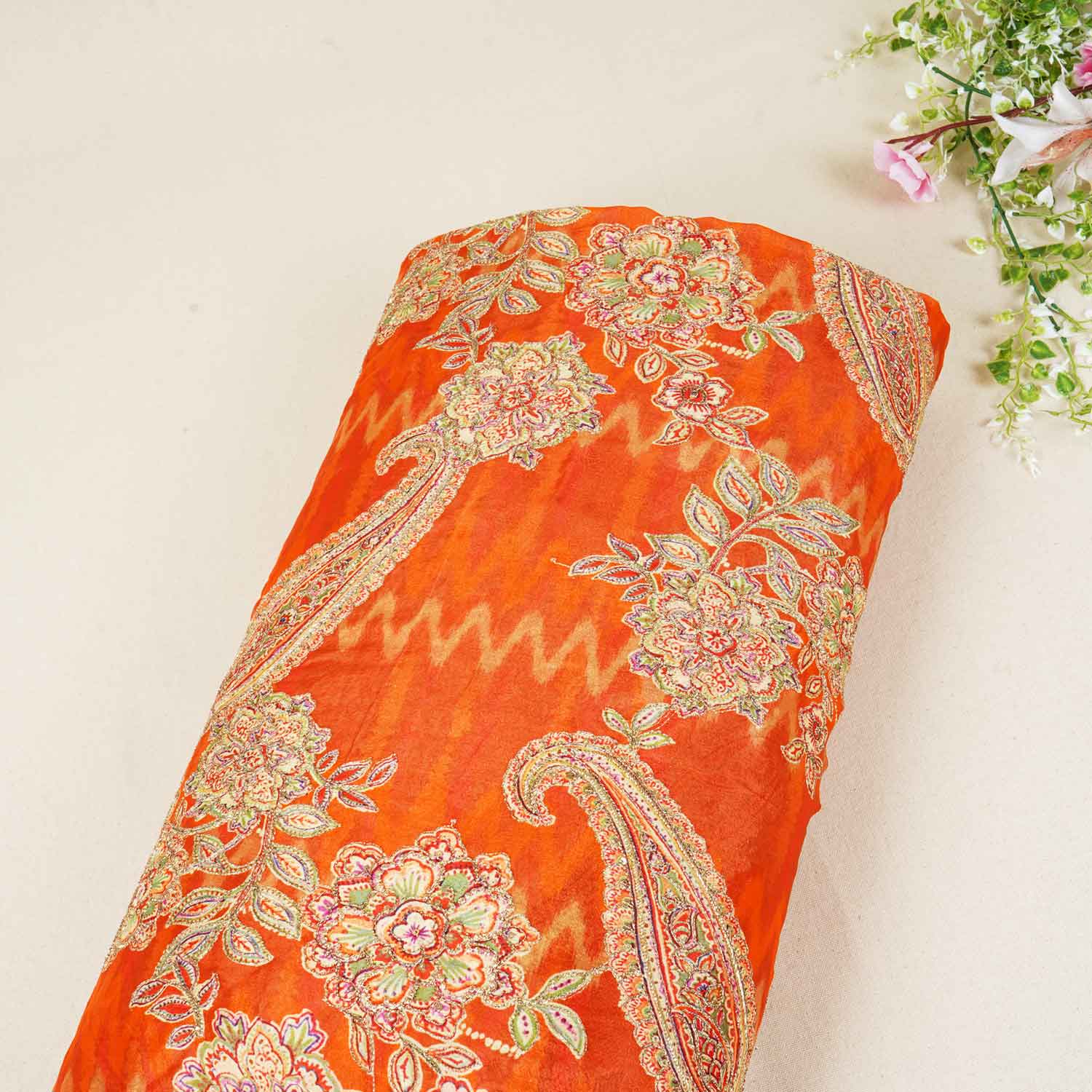 This Orange Position Print Zari Embroidery Chinnon Fabric blends the shimmer of zari embroidery with the soft, graceful fall of chinnon. Perfect for festive dupattas, gowns, or elegant ethnic wear.