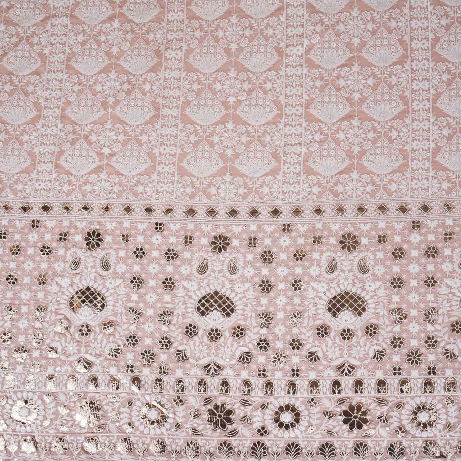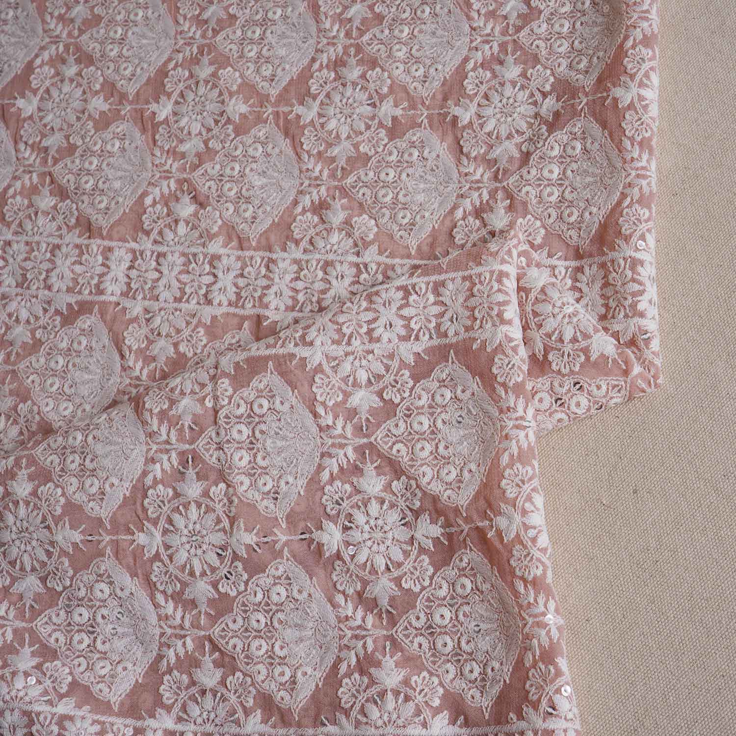 This Peach Chikankari Embroidery Georgette Fabric merges delicate chikankari embroidery with soft georgette drape. Perfect for lehengas, kurtas, or festive ensembles that exude refined charm.