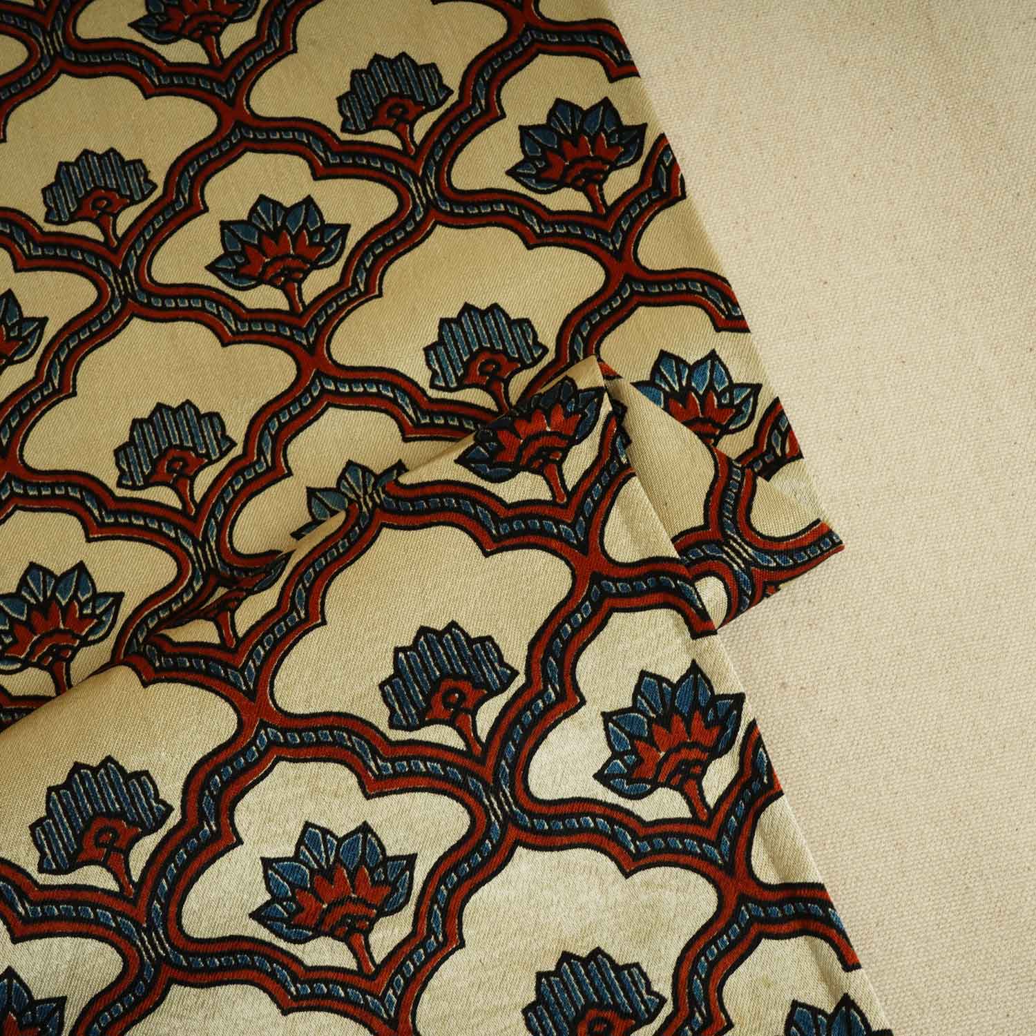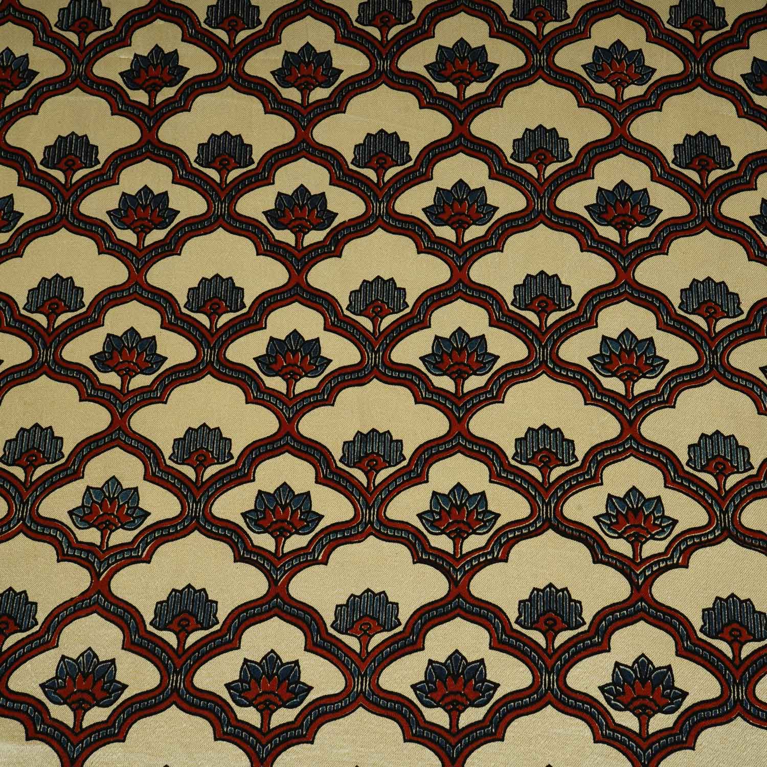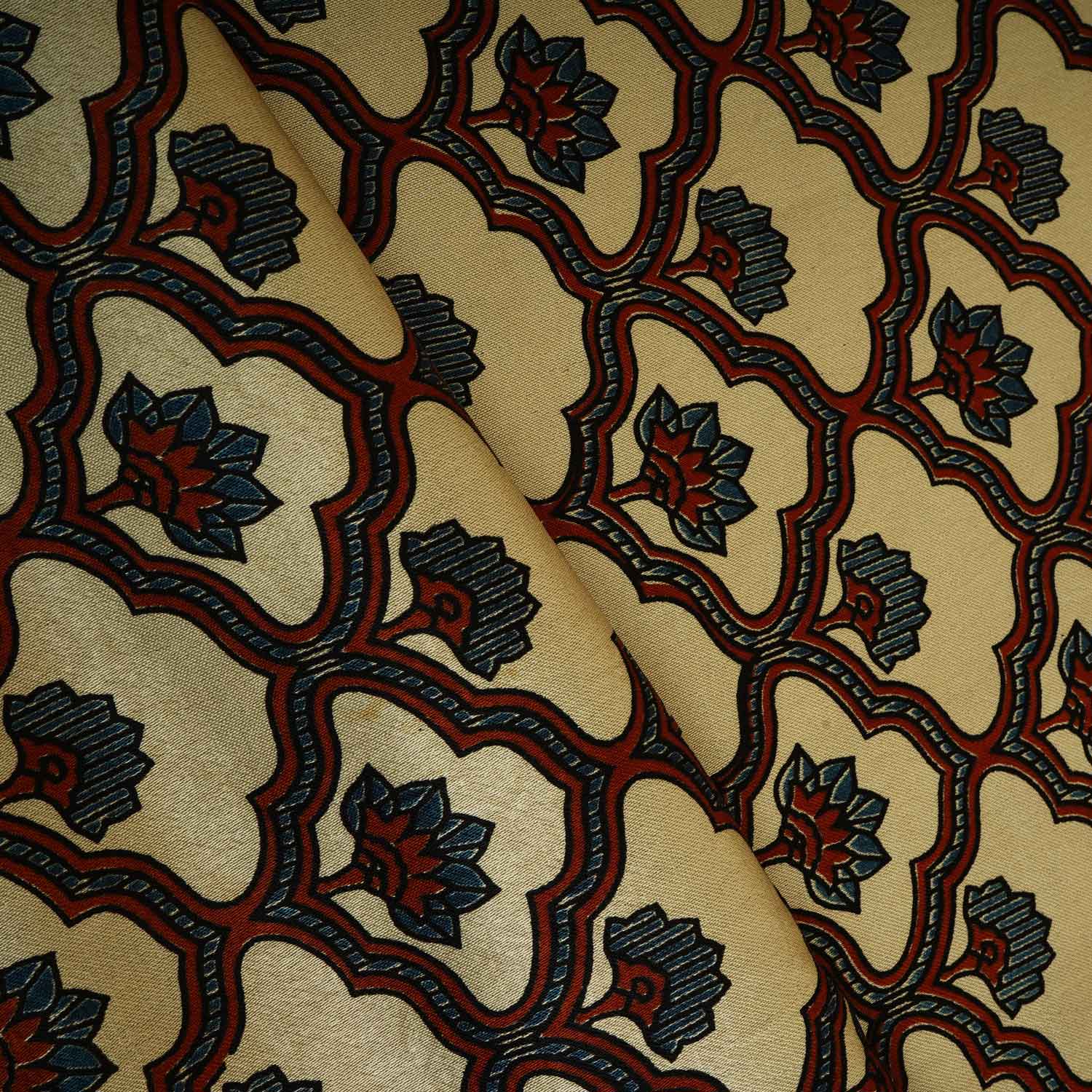This Peach Floral Print Mashru Silk Fabric mixes peach warmth with floral charm for graceful draping styles.