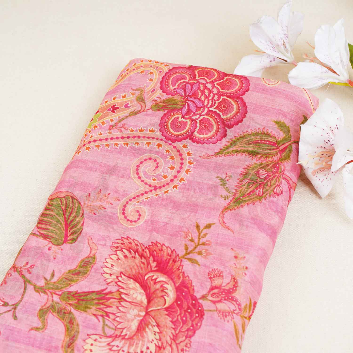 This Pink Floral Print Organza Fabric features a sheer, crisp base highlighted with gentle floral prints that add charm without overpowering the look. The lightweight organza gives structure and flow, making it suitable for sarees, dupattas, overlays or statement sleeves. Its soft pink tone brings a romantic touch, ideal for festive wear, celebrations or elegant outfits with a light and graceful finish.