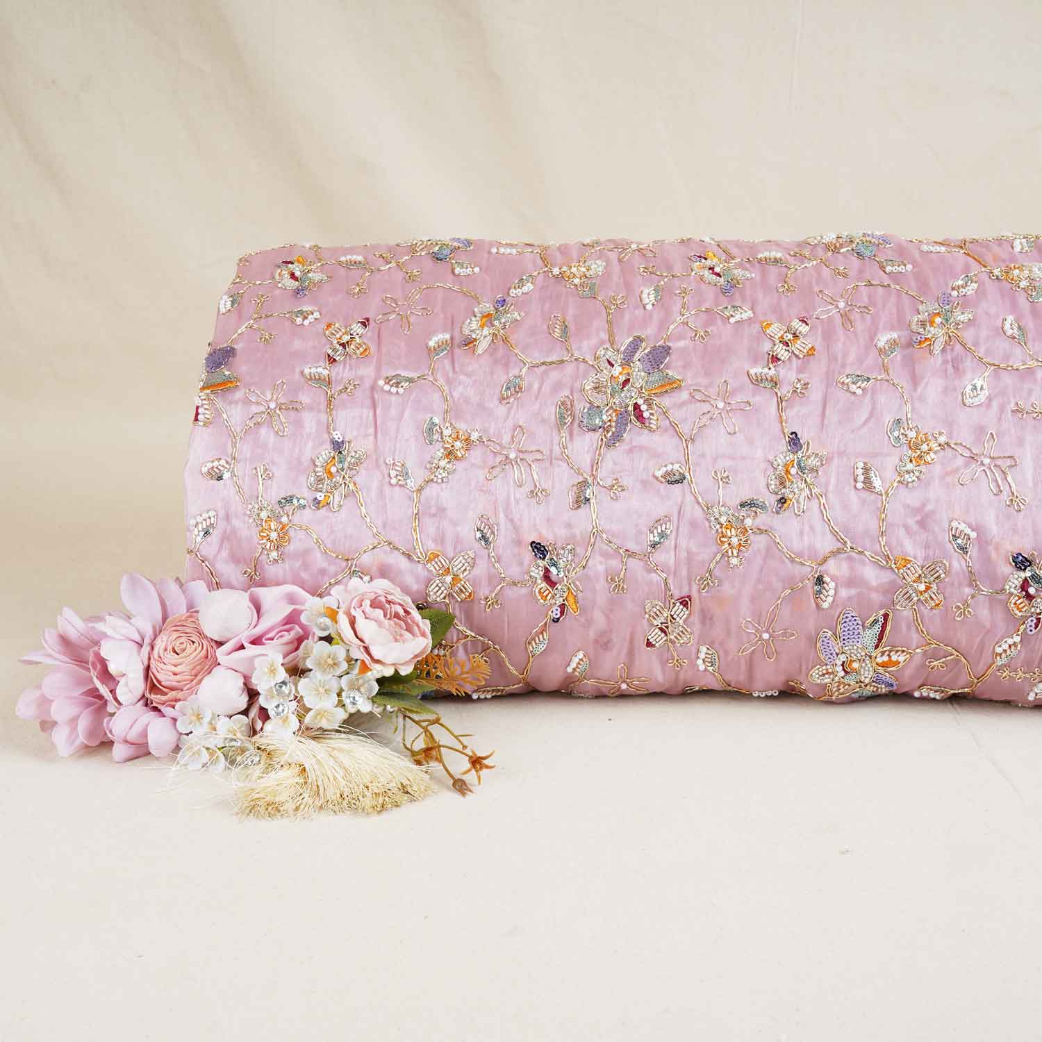 This Pink Floral Zari Embroidery Tissue Organza Fabric blends a soft base with floral motifs highlighted by zari embroidery. The subtle shimmer and graceful drape make it ideal for gowns, dresses or festive outfits that need elegance, movement and a modern yet traditional aesthetic.