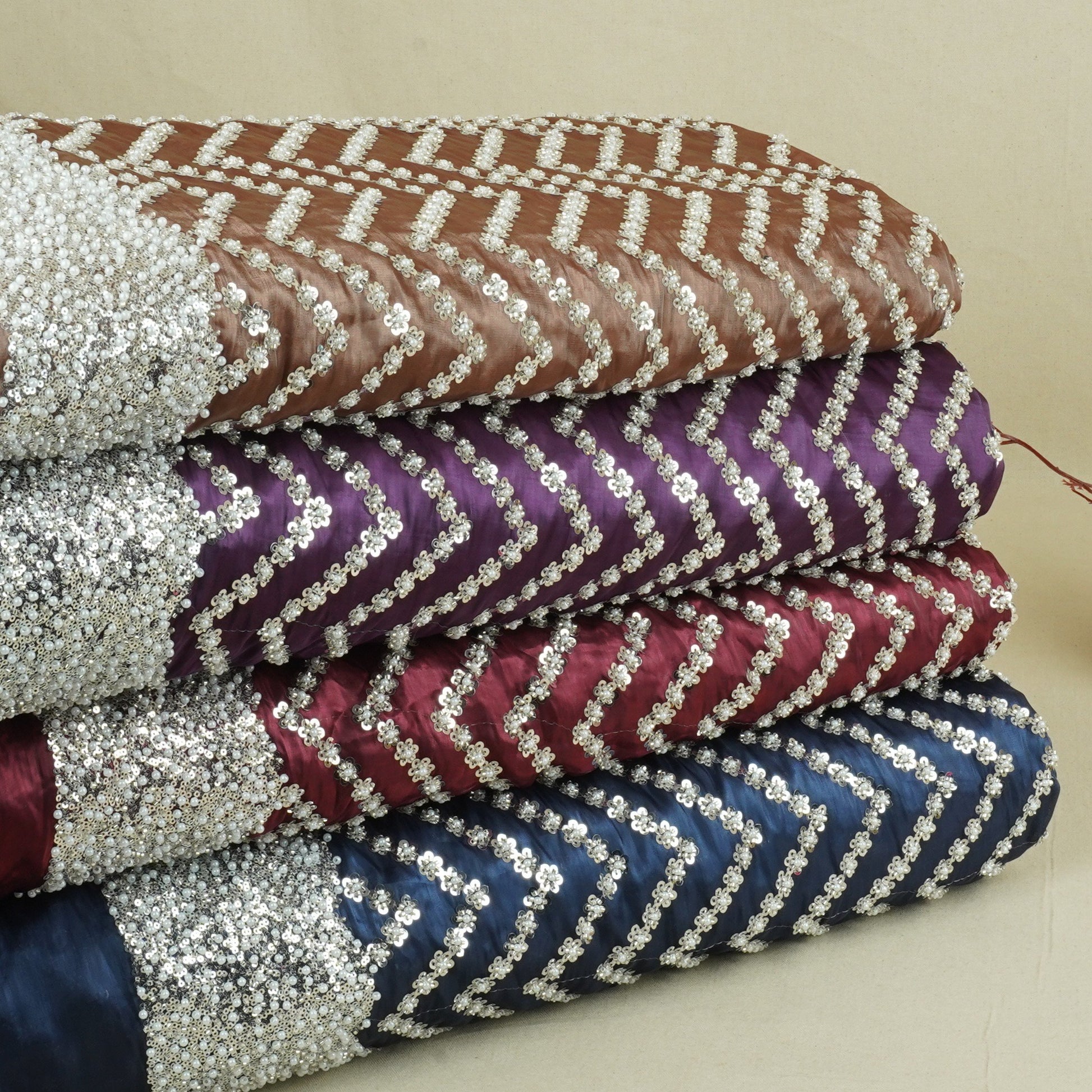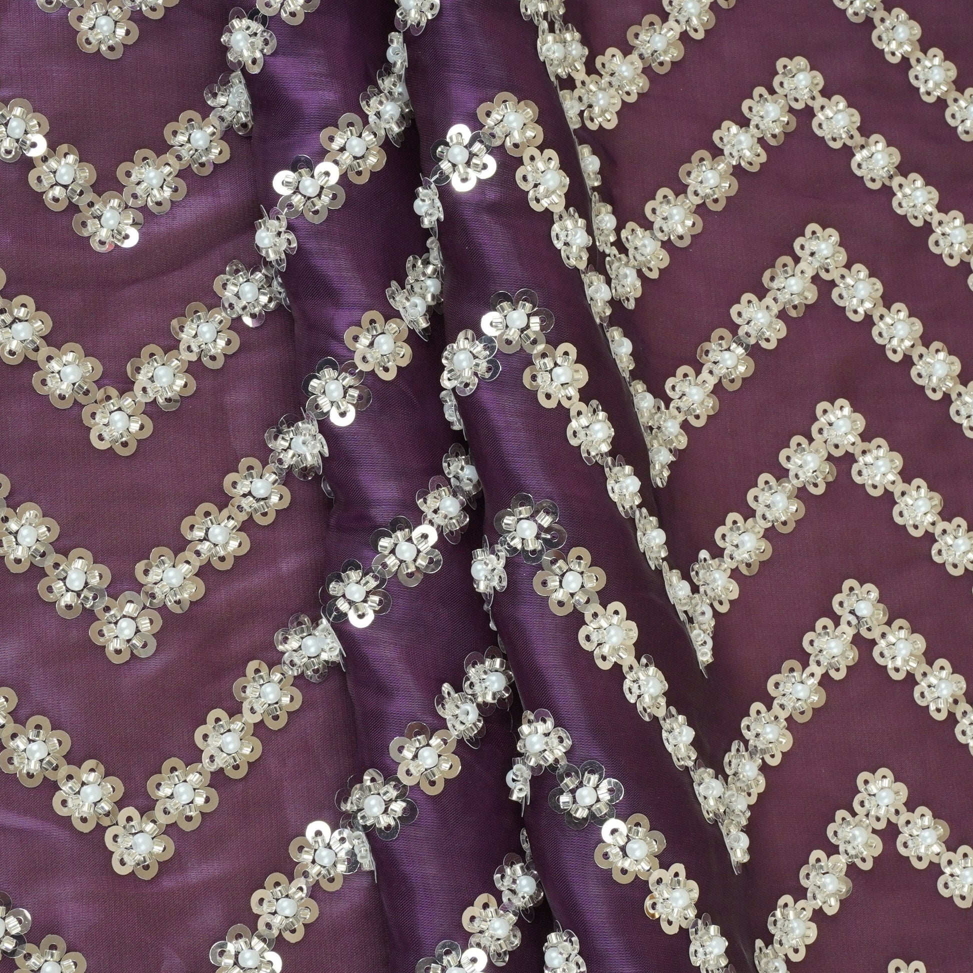 This Purple Sequence Cutdana Embroidery Organza Fabric blends a rich hue with fine decorative work to create an elegant festive fabric. The translucent organza base allows the embroidery to shine, making it suitable for lehengas, sarees, dupattas, or overlays that need a graceful yet eye-catching finish.