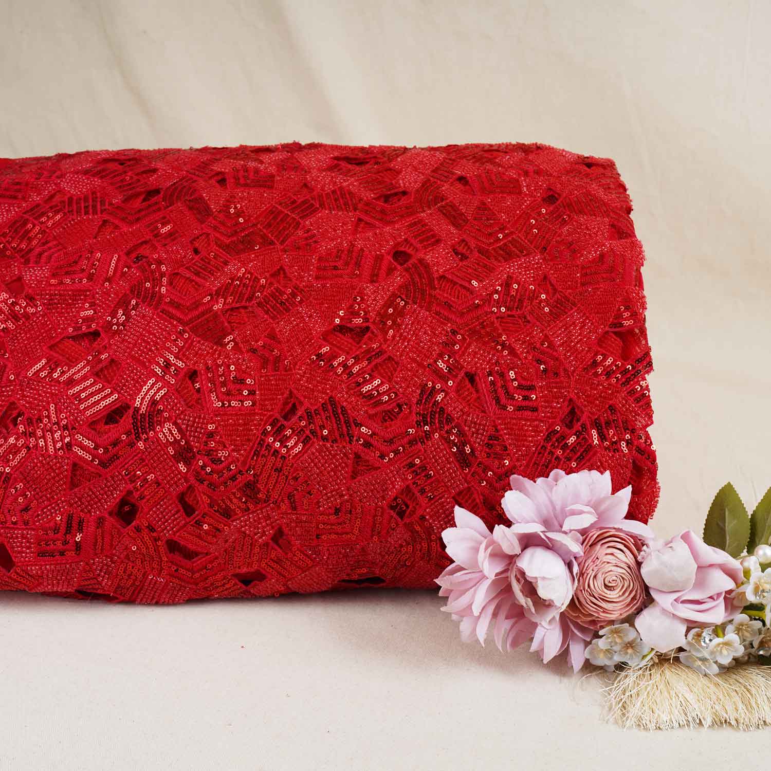 This Red Cutwork Embroidery Net Fabric combines intricate cutwork embroidery with a fine net base for a rich yet airy appeal. The detailed patterns add depth while the net keeps the fabric light and fluid, making it perfect for sarees, lehengas, blouses or statement dupattas. The bold red shade enhances festive looks, offering a balance of elegance, craftsmanship and visual impact.
