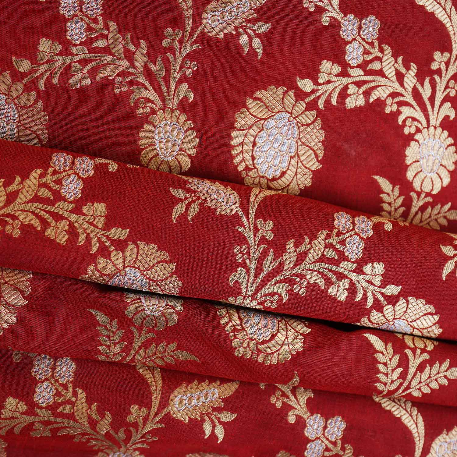This Red Floral Jaal Katan Silk Fabric showcases an intricate all-over floral jaal pattern that feels rich yet graceful. The detailed design spreads evenly across the surface, creating depth without looking heavy. Its elegant flow makes it suitable for sarees, suits, lehengas, or statement dupattas where traditional detailing and refined color come together for a timeless ethnic look.