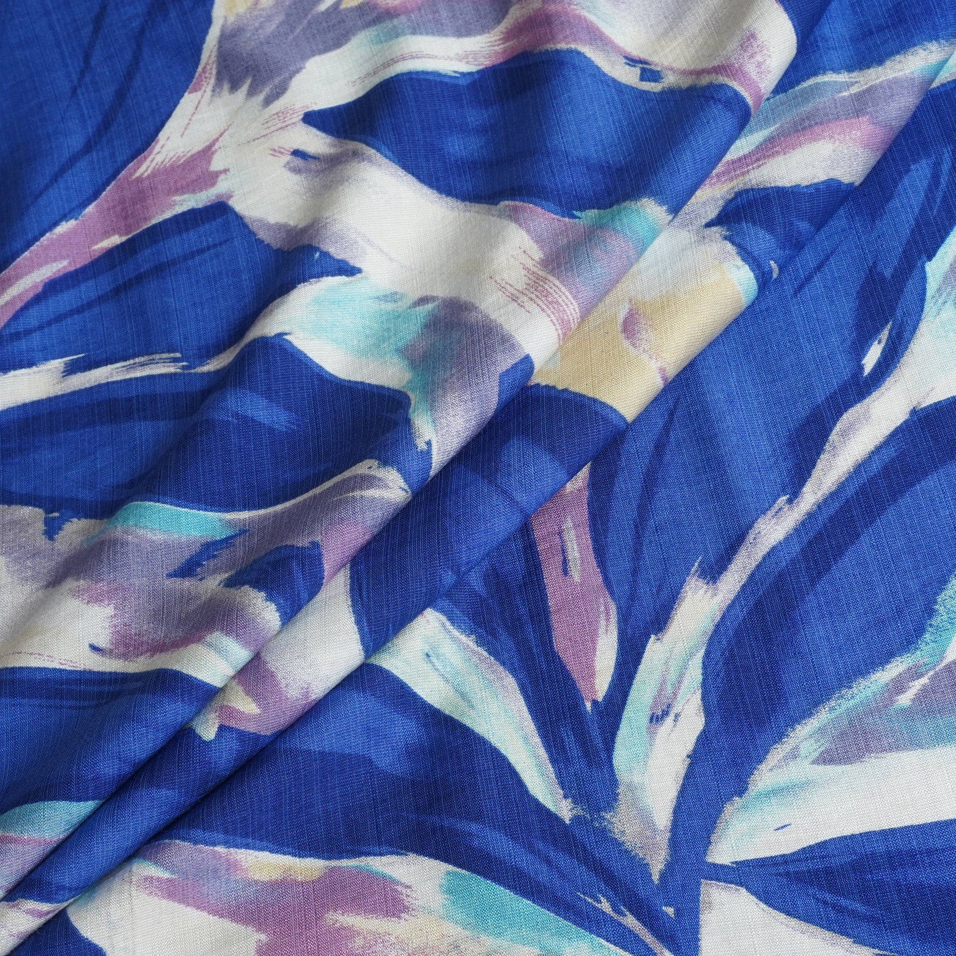 Elegant royal blue viscose linen featuring a vibrant multicolor abstract print. Soft, breathable, and lightweight, perfect for stylish apparel and casual wear. The striking pattern adds a contemporary touch to traditional fabric, making it ideal for dresses, tops, and creative fashion projects. Premium quality with effortless comfort and drape.