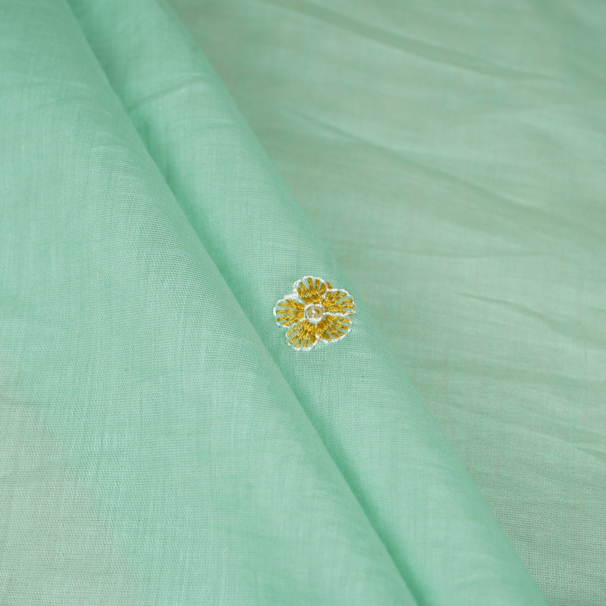 Elegant Sea Green Mul Chanderi Fabric adorned with delicate floral border embroidery, perfect for festive and casual wear. Lightweight, breathable, and sheer, this fabric drapes beautifully, offering a luxurious texture. Ideal for sarees, suits, and designer ensembles, it blends traditional charm with contemporary elegance for a timeless wardrobe addition.