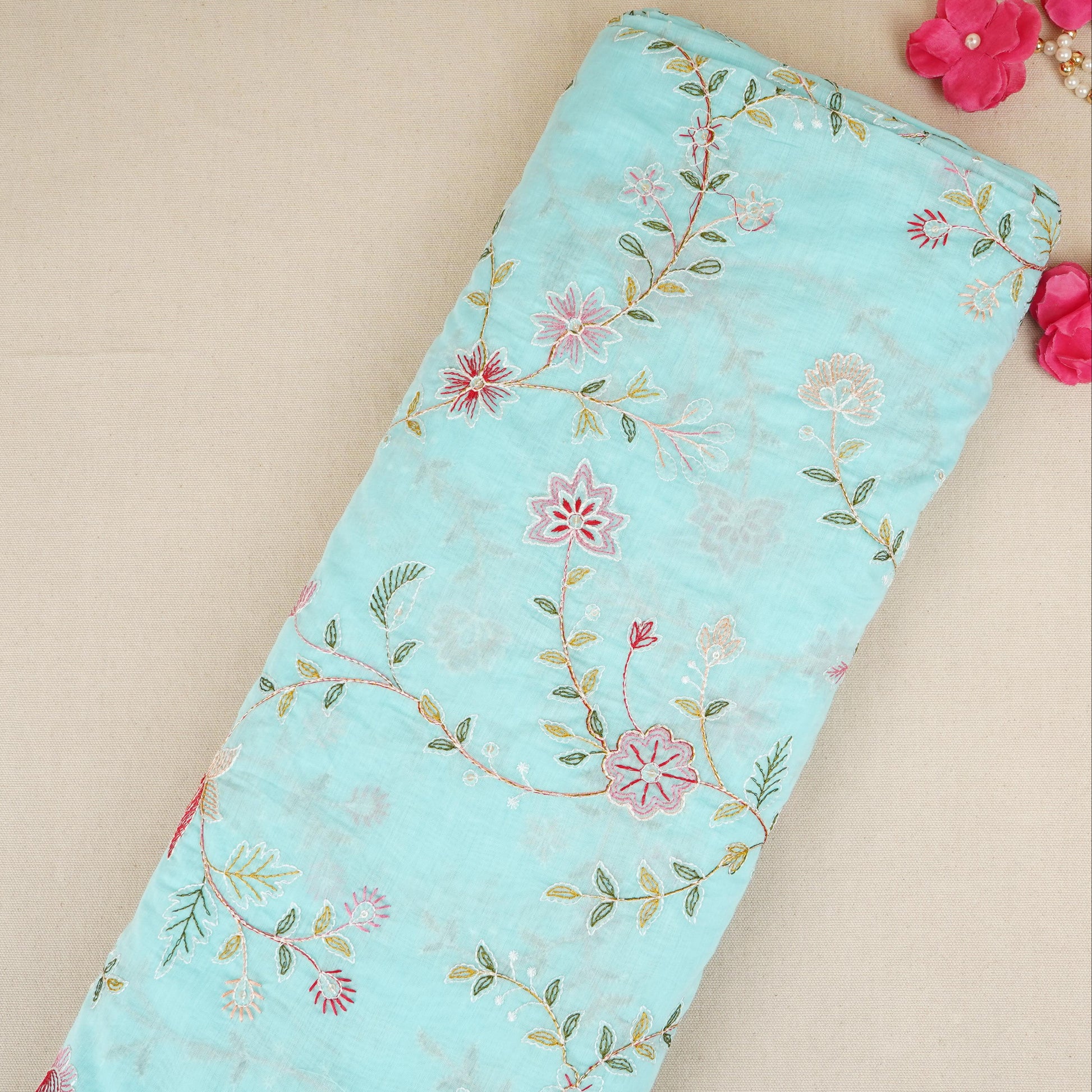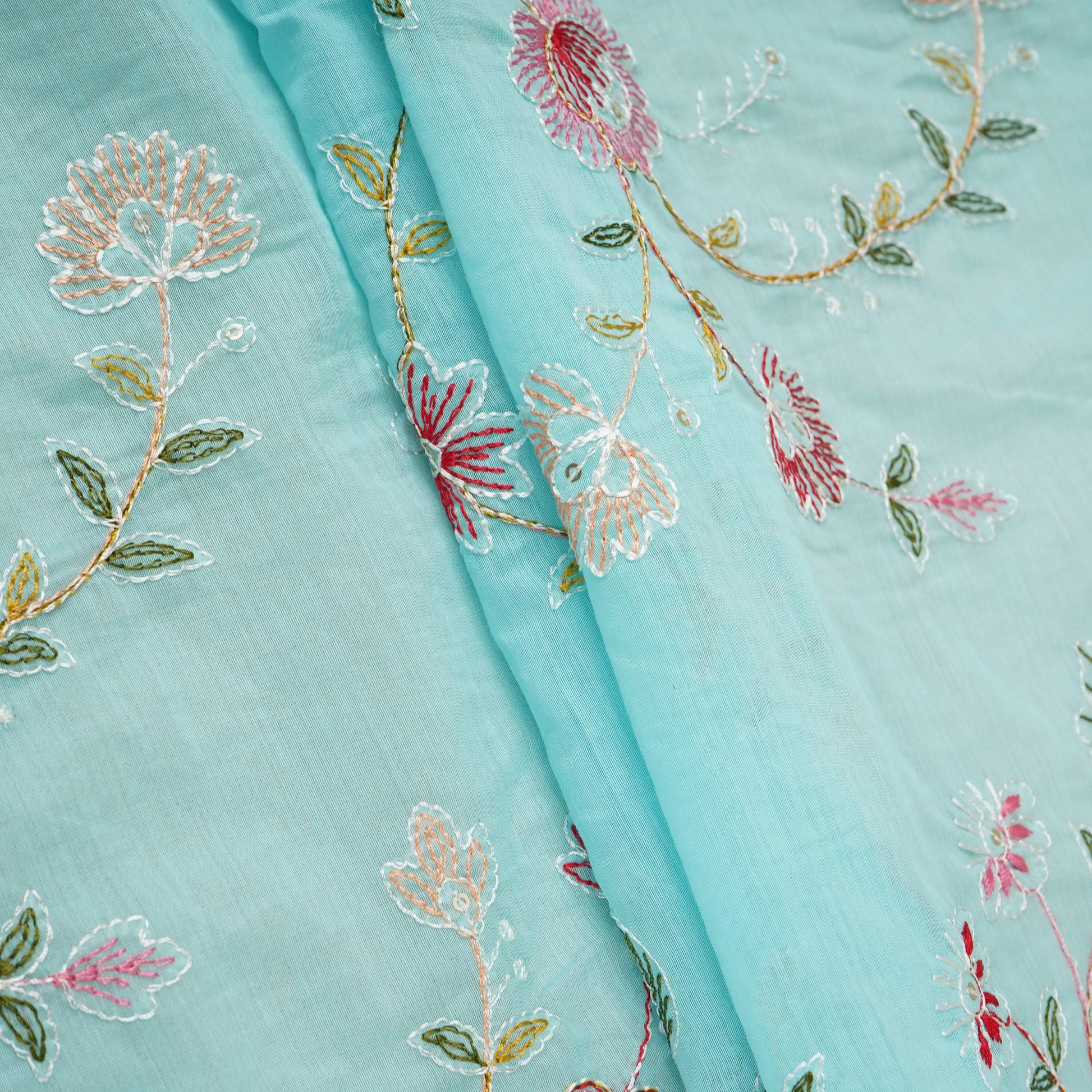 Product Name Sky Blue Mughal embroidery Mul Chanderi Fabric DC-29674