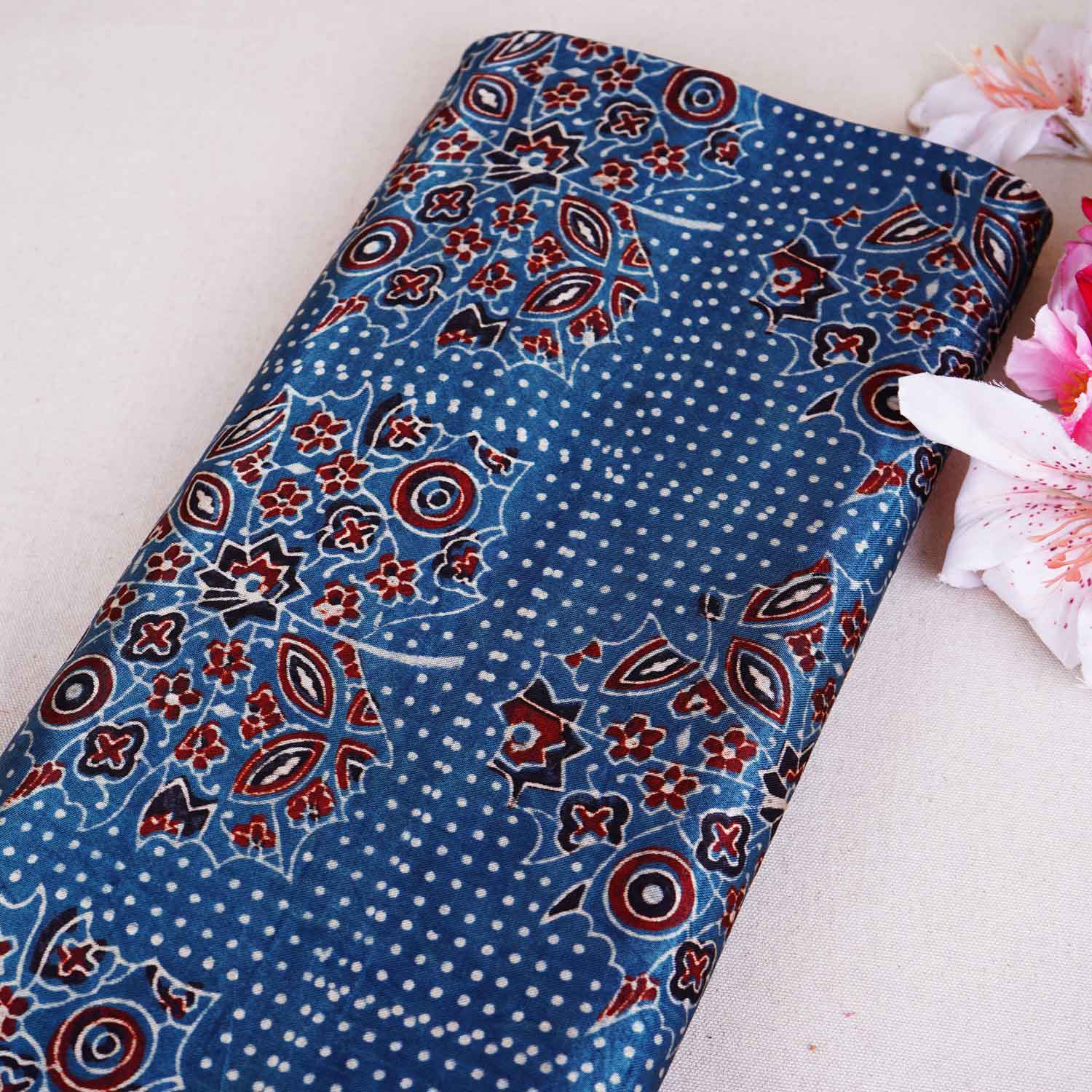 Product Name Teal Blue Ajrakh Print Mashru Silk Fabric EEG-28659