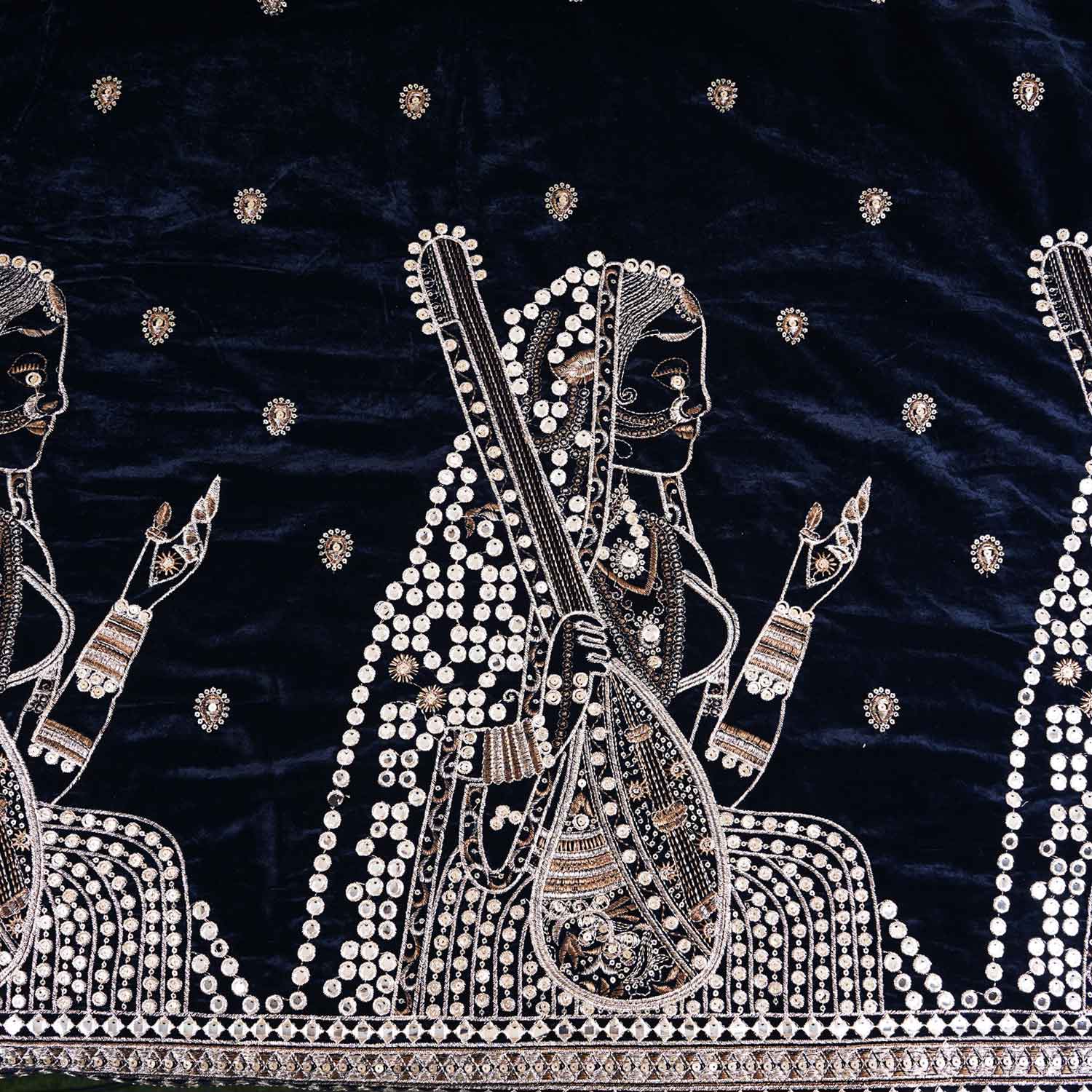 This Teal Blue Embroidery Velvet Fabric combines plush velvet with intricate embroidery for a refined, regal finish. The vibrant teal tone adds depth and richness, making it perfect for blouses, jackets or festive outfits. A strong choice for designs that focus on texture and elegance.