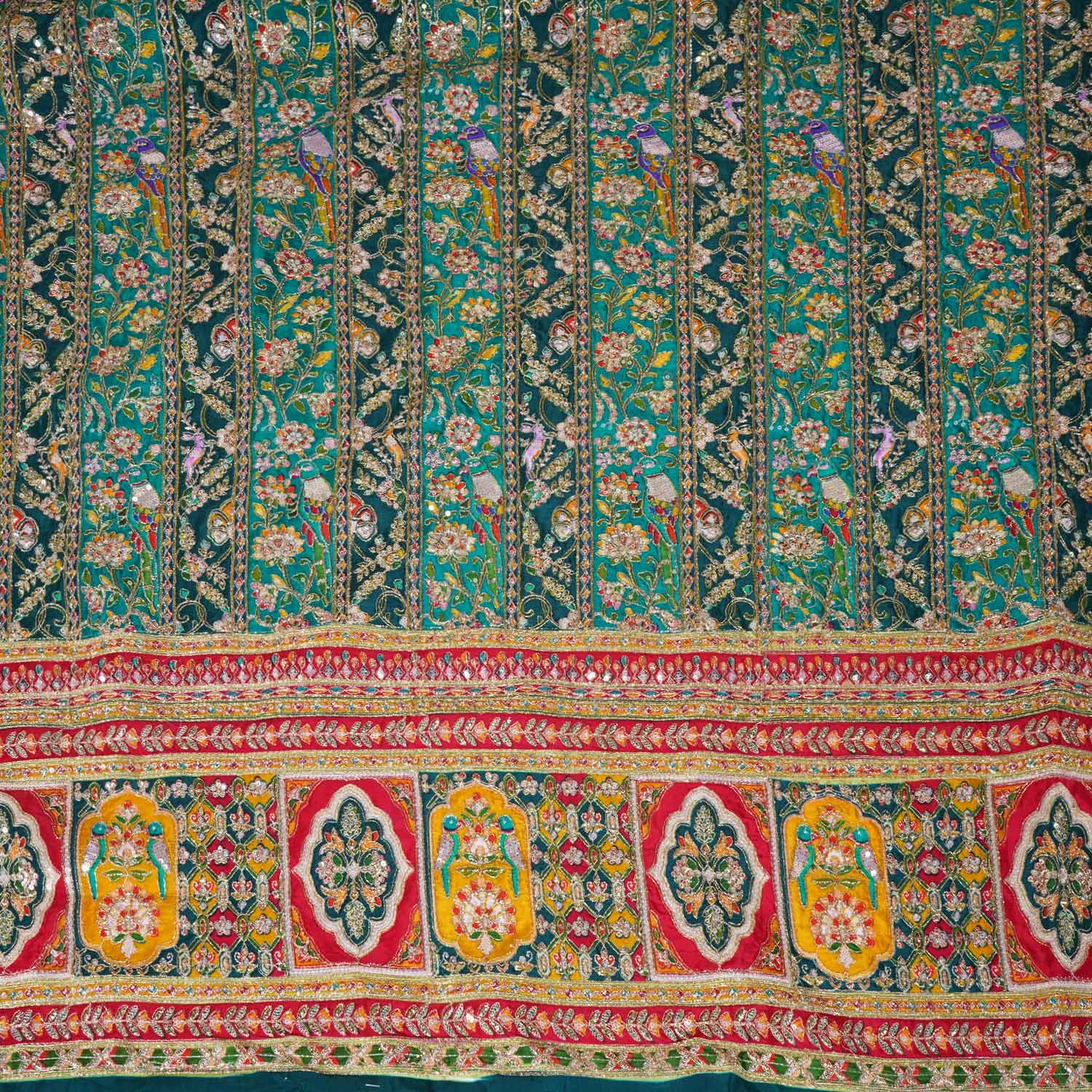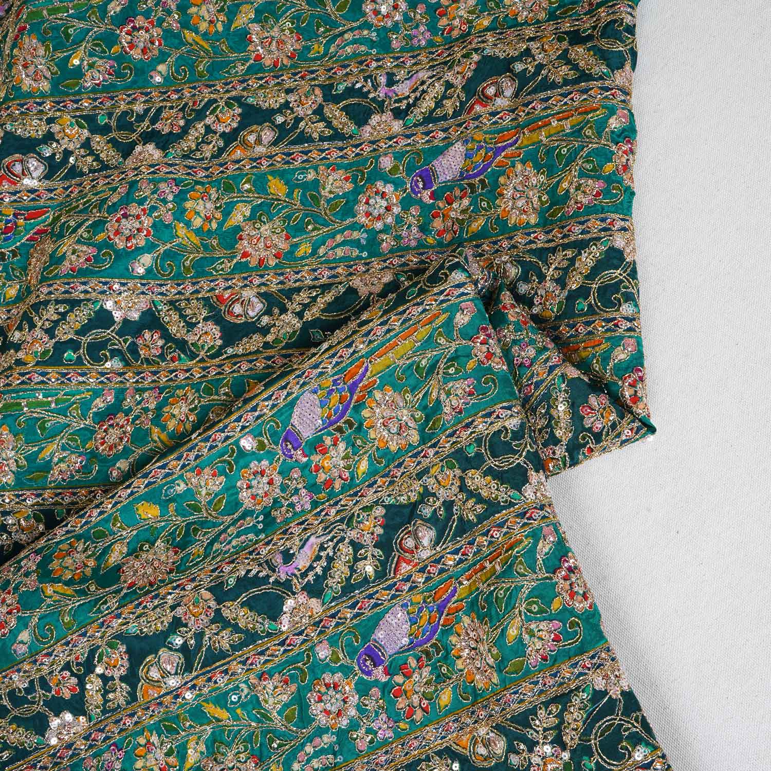 This Teal Blue With Multicolour Zari Embroidery Crepe Fabric merges intricate embroidery with luxurious drape. Perfect for lehengas, kurtas, or festive ensembles that exude celebratory charm.