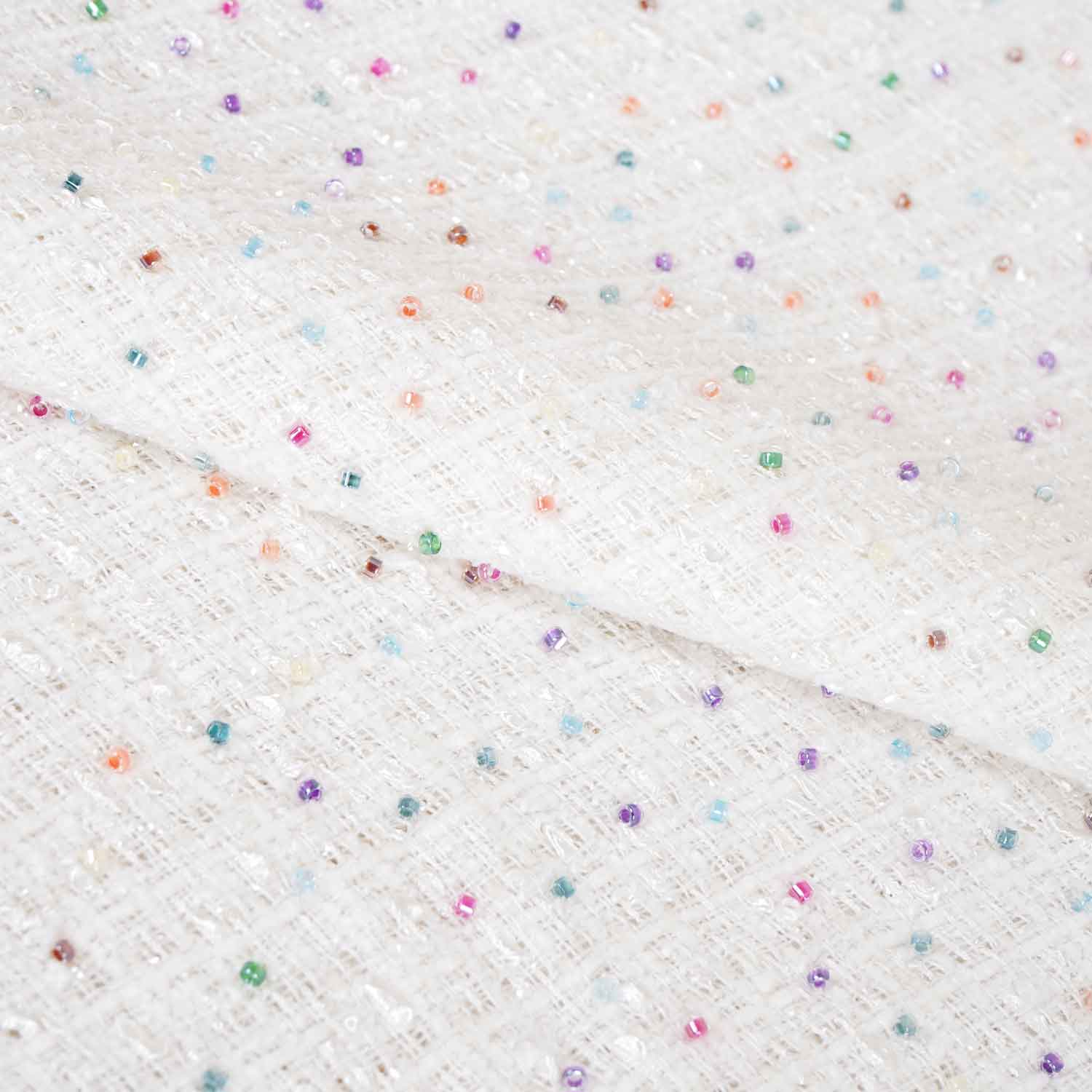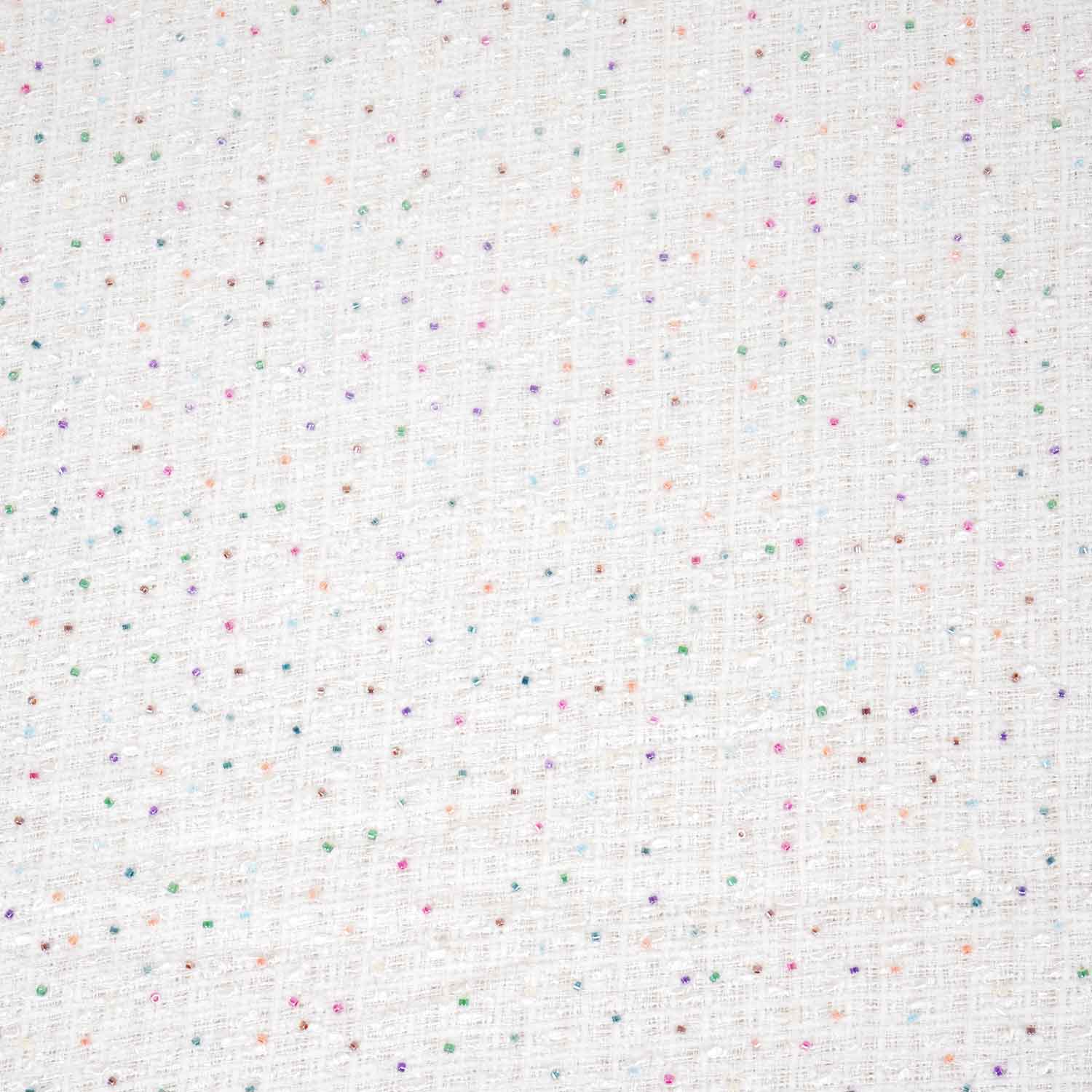This White Cutdana Tweed Fabric merges sparkling embellishments with textured elegance. Perfect for jackets, skirts, or festive ensembles that stand out.