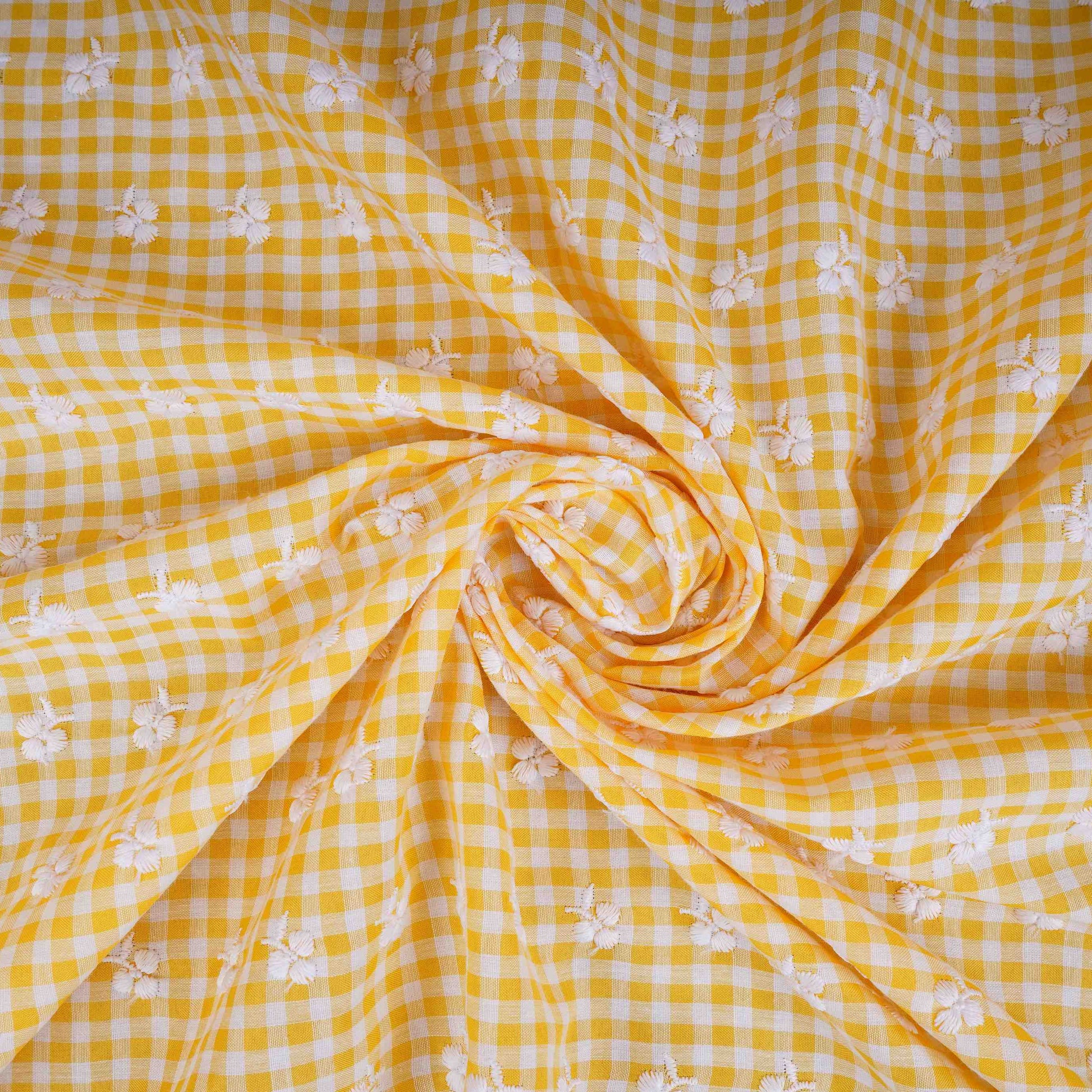 Product Name Yellow & White Check Floral Embroidery Cotton Fabric MJF-30612