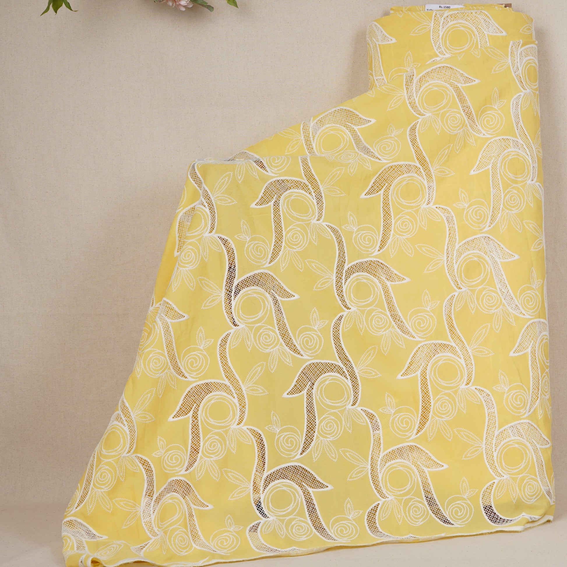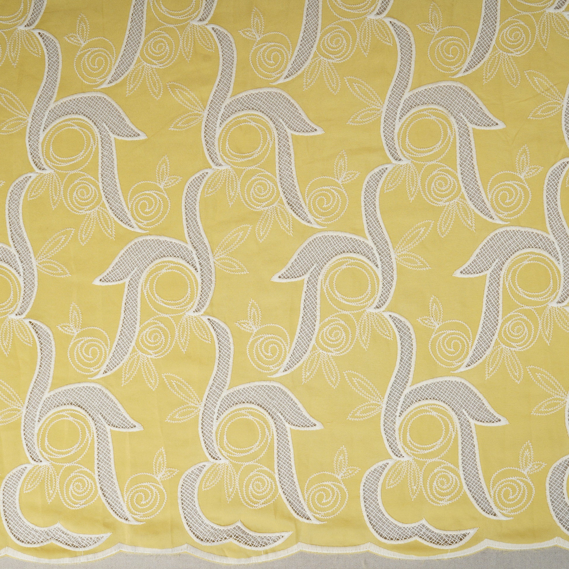 Brighten your creations with this Yellow Floral Embroidery Schiffli Crepe Fabric. Crafted from lightweight, soft crepe, it features delicate Schiffli floral embroidery, adding elegance and texture. Perfect for dresses, tunics, or festive wear, this fabric combines comfort with intricate design, making every outfit vibrant, stylish, and sophisticated.