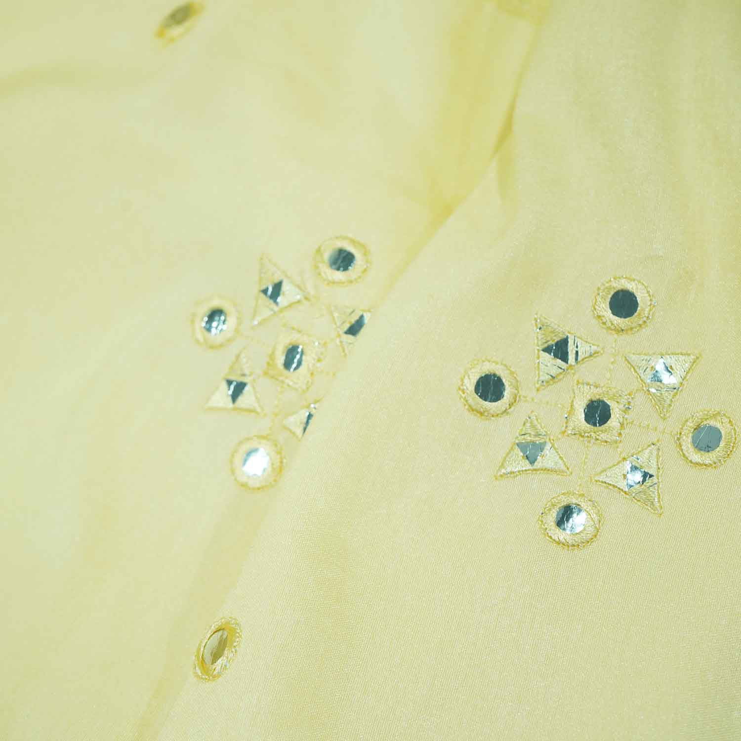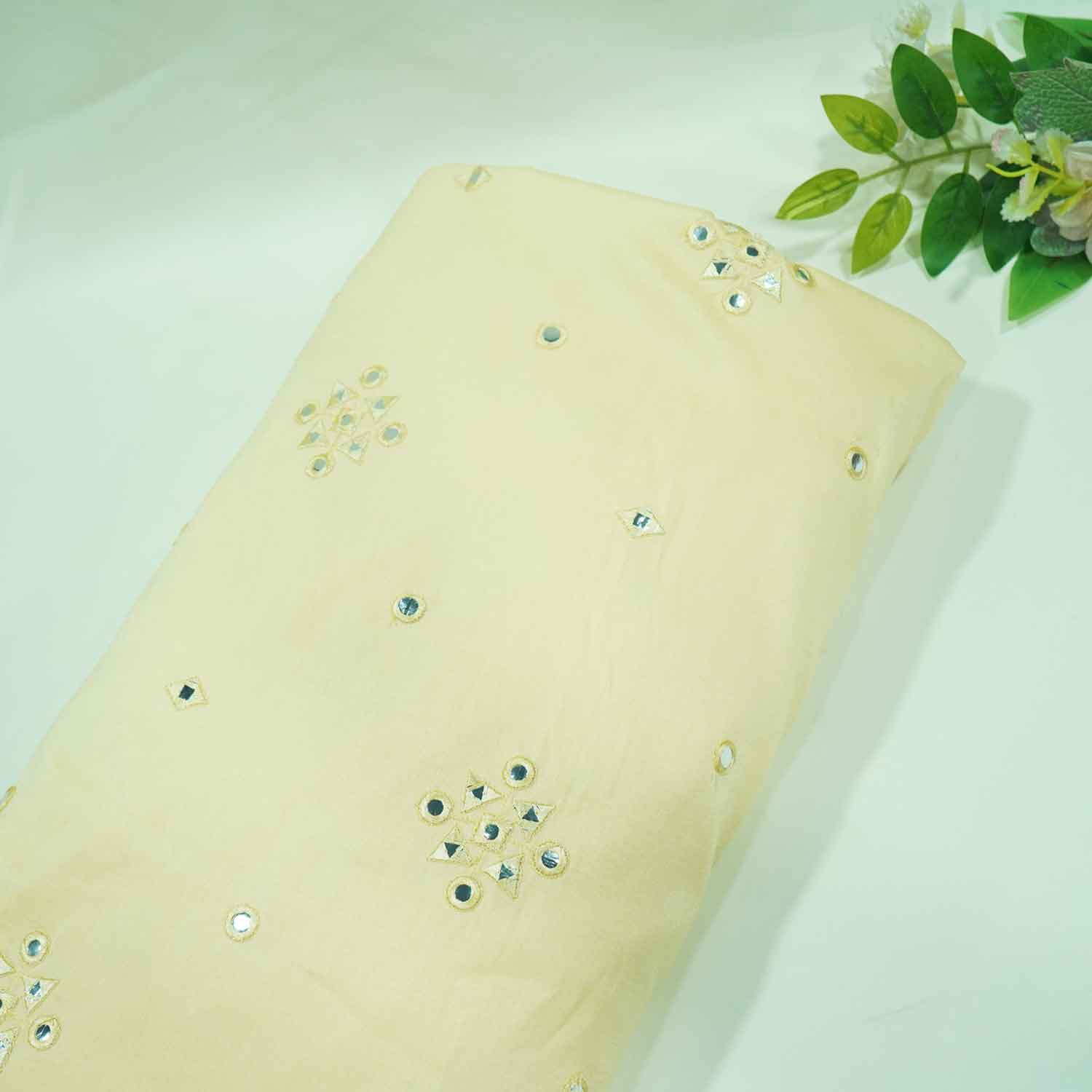 This Yellow Mirror Embroidery Russian Silk Fabric merges shimmering embellishments with luxurious drape. Ideal for festive lehengas, sarees, or statement pieces.